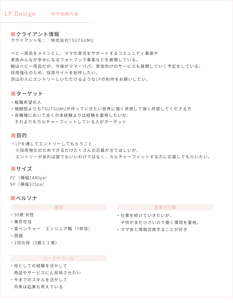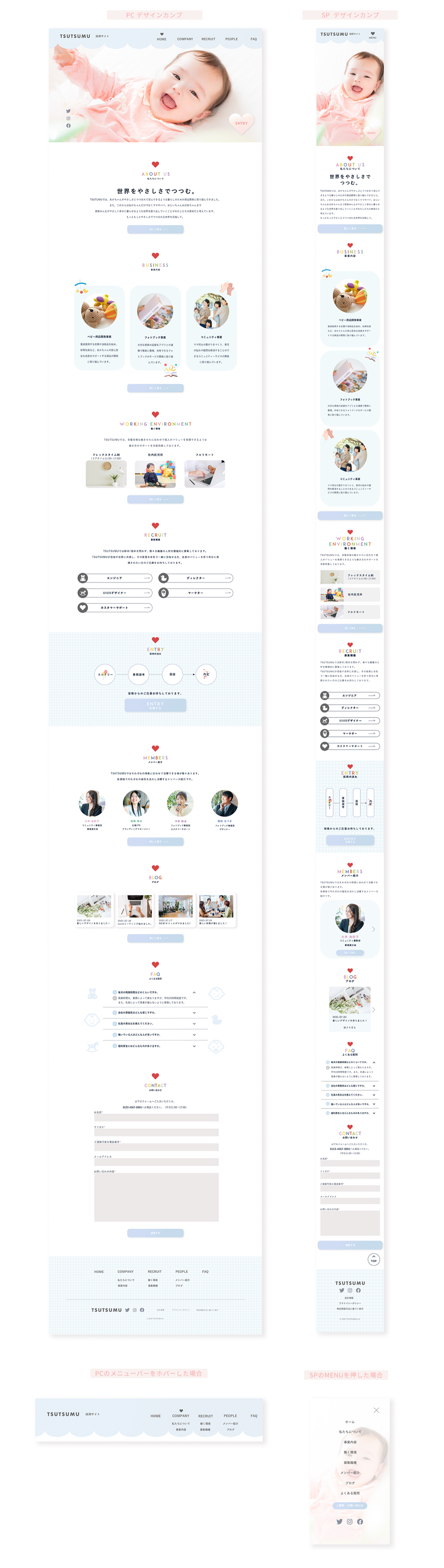 採用サイト以外にも赤ちゃん関連のサイトを参考にしました。どのような配色がユーザーにどのような印象を与えるのかなどを細かく分析し、実際のデザインをつくる時に意識しました。また、SPのデザインカンプが指でも押しやすいようなボタンの大きさなども意識しました。