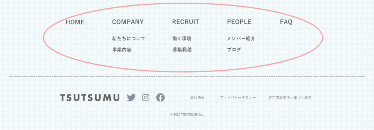 ②PC:フッターに、メニューを追加することでフッターまで来ても見たい部分に戻れるに工夫しました。
