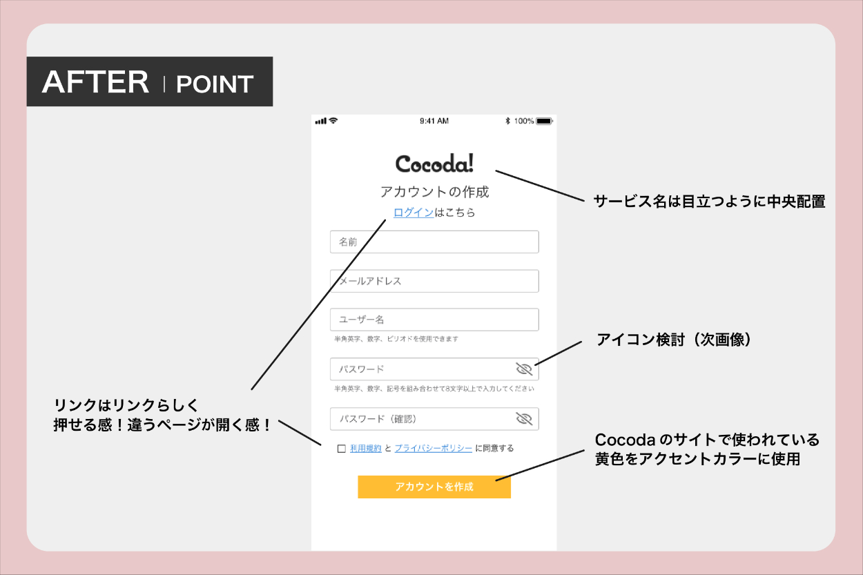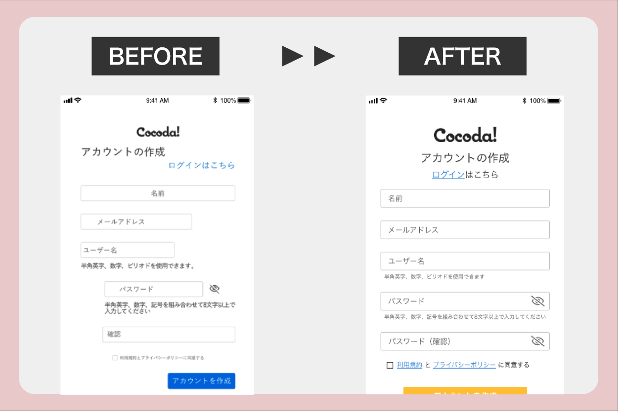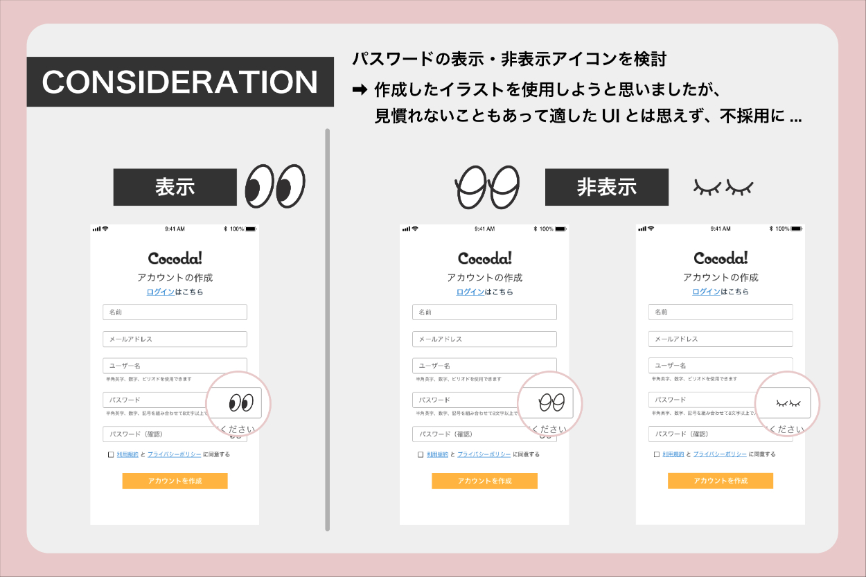 目を伏せるようなアイコンだったらかわいいな、と思い、イラレで描いて入れてみたのですが、ボタンっぽく見えないような感じがしたので、サンプルに入っていたアイコンを使用しました。
