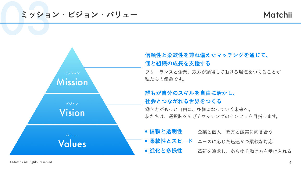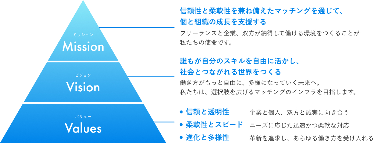 概念的なミッションから行動指針のバリューに向かって落とし込んでいる、という見せ方にしたかったので、三角形の階層式のデザインにしました。落とし込んでいる表現をより伝えるためにグラデーションを使用して視線を誘導するように設計しました。