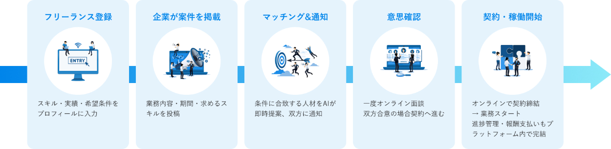 図解は「すべてオンラインで完結」を表現するために、グラデーションの矢印を入れて一連の流れがオンラインで一括で行われているように設計しました。ビジネス的な信頼感がありつつもトンマナに合わせたイラストを入れました。