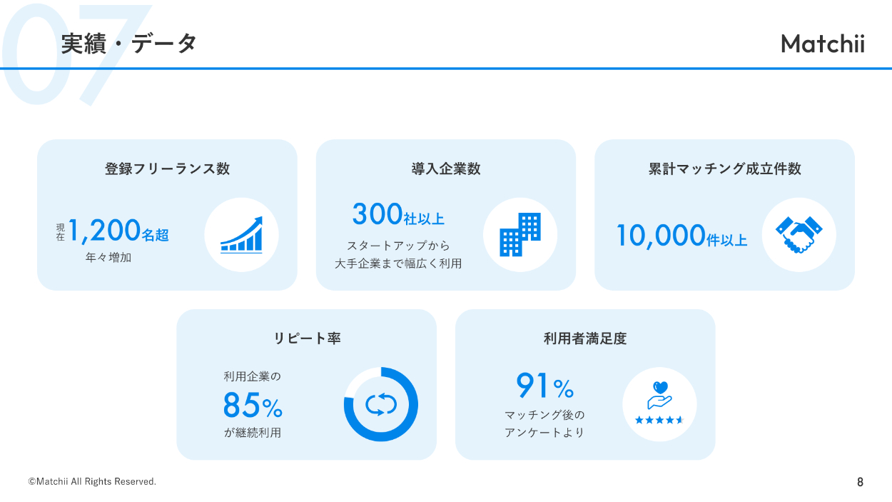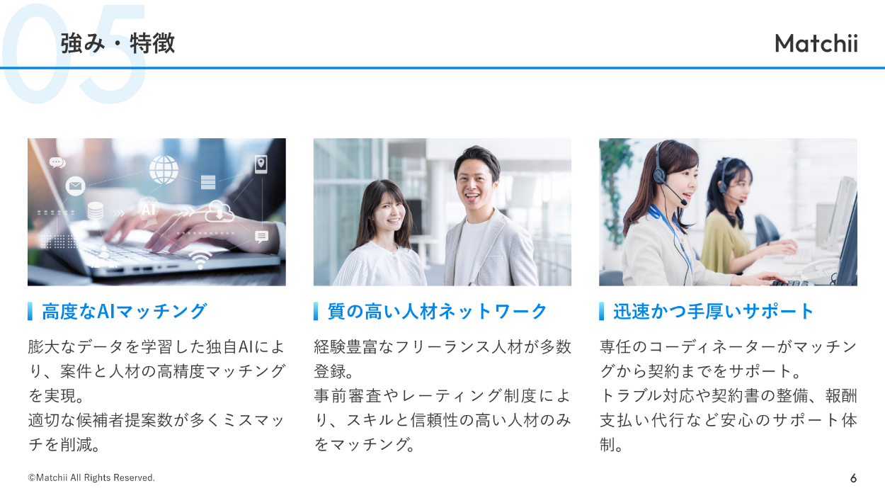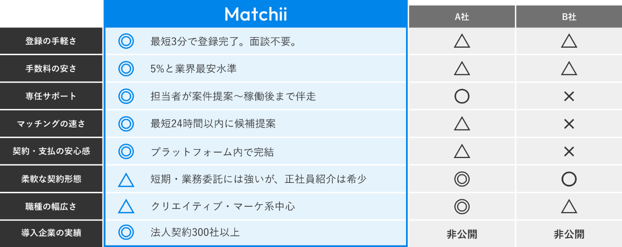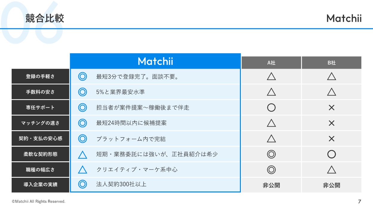 Matchiiに目線が向くように、色味では、Matchii→青系・A社&B社→グレースケールに配色し、さらにMatchiiの部分を飛び出すような設計をしました。