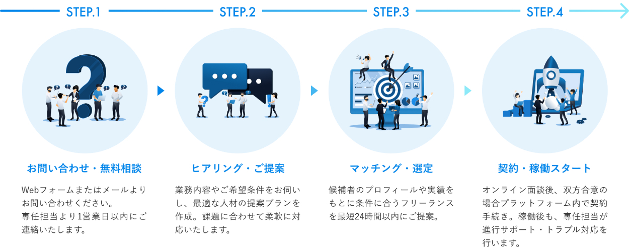 正社員雇用は考えていないが人手が不足しており、業務委託への依頼を検討している企業。自社の業務特性やカルチャーにマッチした人材を探している。