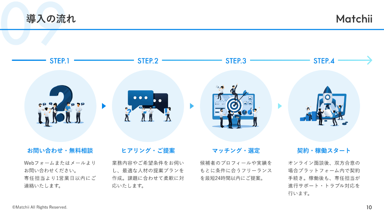 サービス概要の図解と同じく、一連の流れを表現するために、STEP1〜STEP4の下にグラデーションの矢印を入れまいた。こちらもビジネス的な信頼感がありつつもトンマナに合わせたイラストを入れました。