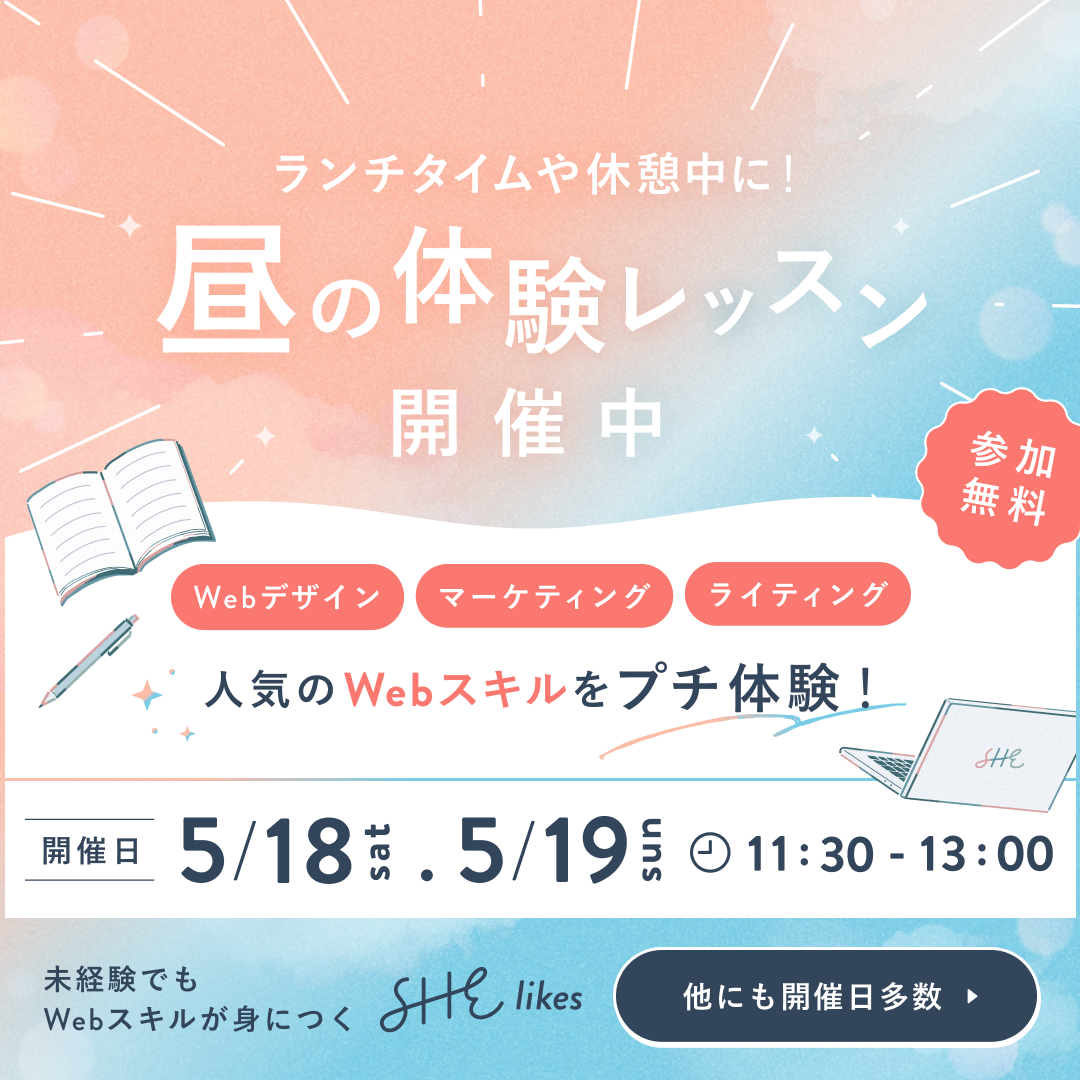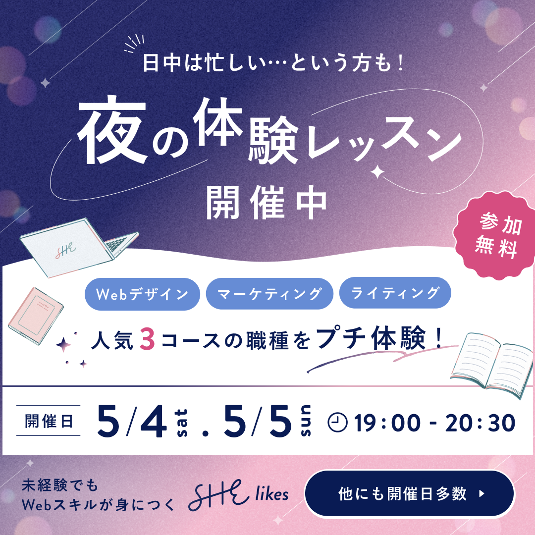 SHE株式会社様が運営する女性向けキャリアスクール「SHElikes」体験レッスンへの誘導を目的としたSNS広告バナーを制作しました。 使用ツール:Figma、Illustrator/制作時間:約4時間/制作時期:2024年4月