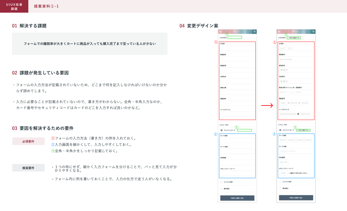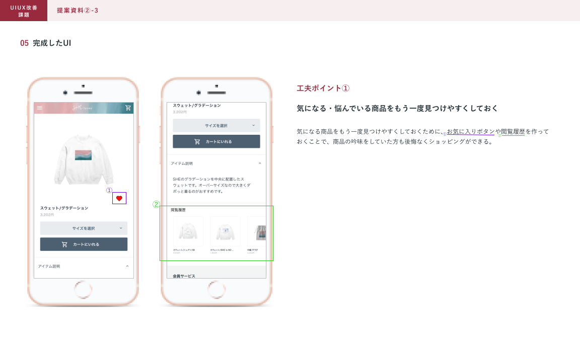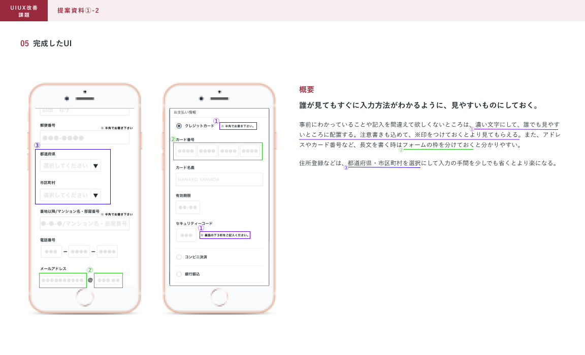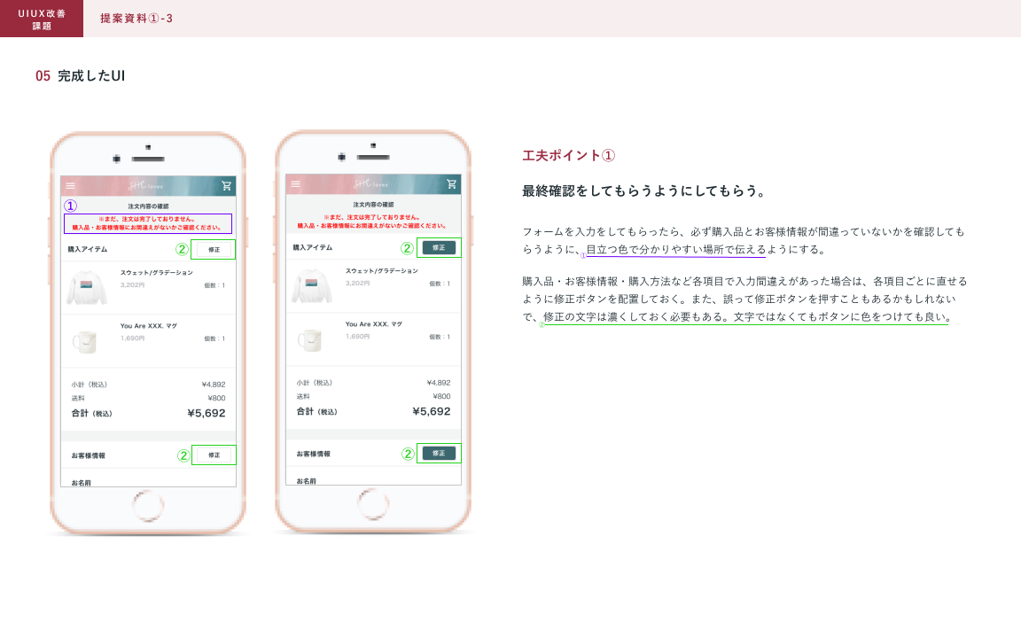 ⚫︎どこを改善したかを囲って番号をつけて、どのような理由で改善したかを文章にしました。それにより、改善前のECサイトと見比べることがなくなりました。