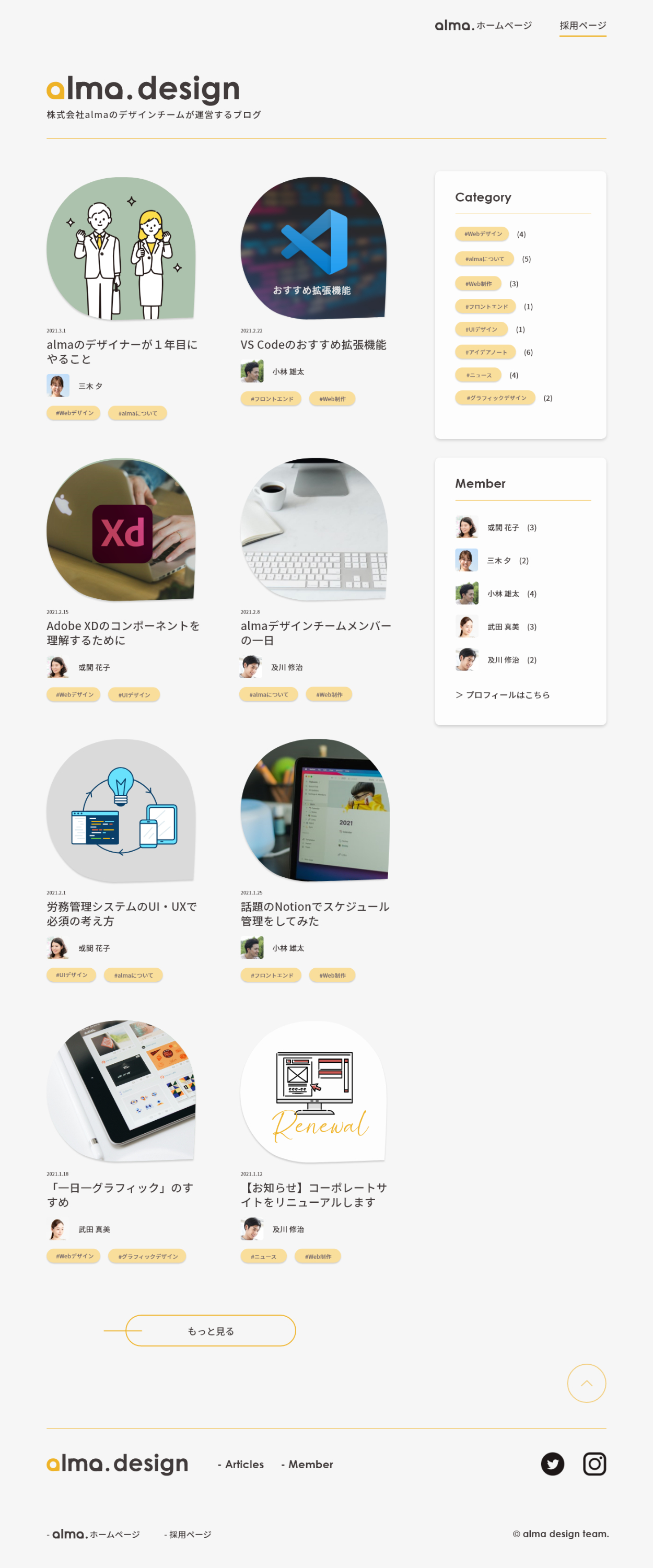 また、ブログを読んで会社に興味を持つ人がいた場合、すぐに会社情報に繋げられるよう、公式サイトのリンクと採用ページのリンクをヘッダーとフッターに固定しました。