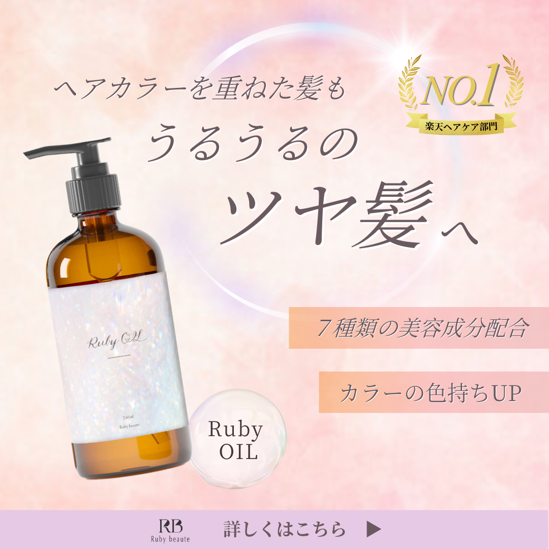 ・Ruby OILはヘアカラーを楽しむ方のお悩みに寄り添ったヘアオイルとして開発されました。 ヘアカラーで傷んだ髪のパサつきを、潤いのある滑らかなツヤ髪へ導きます。 保湿美容成分を7種類配合しており、傷みのケアはもちろん、カラーの色持ちも良くしてくれます。 普段の生活やリラックスタイムにも気にならない無香料。 販売場所:全国のドラッグストア、量販店、楽天 価格:150ml 3,500円