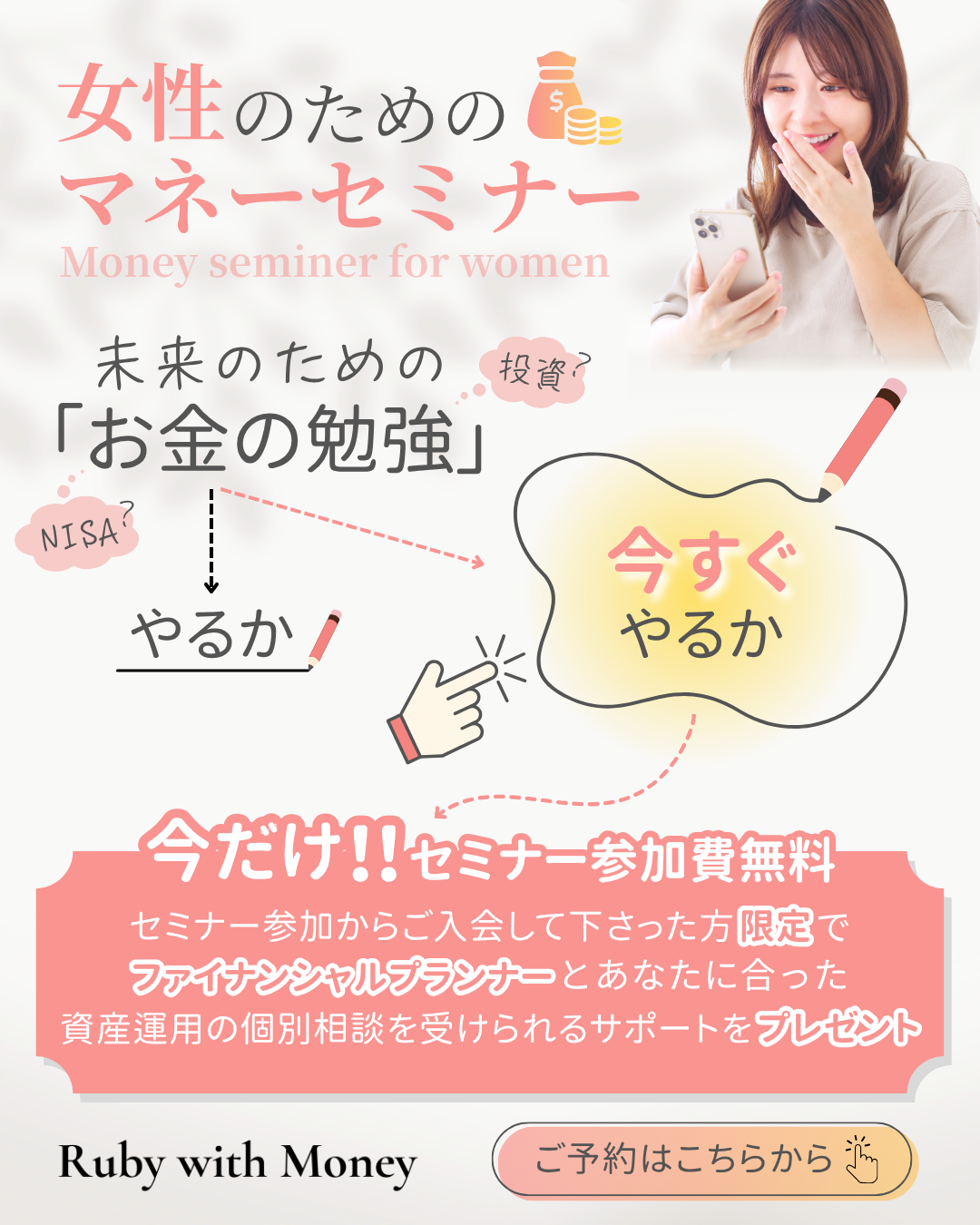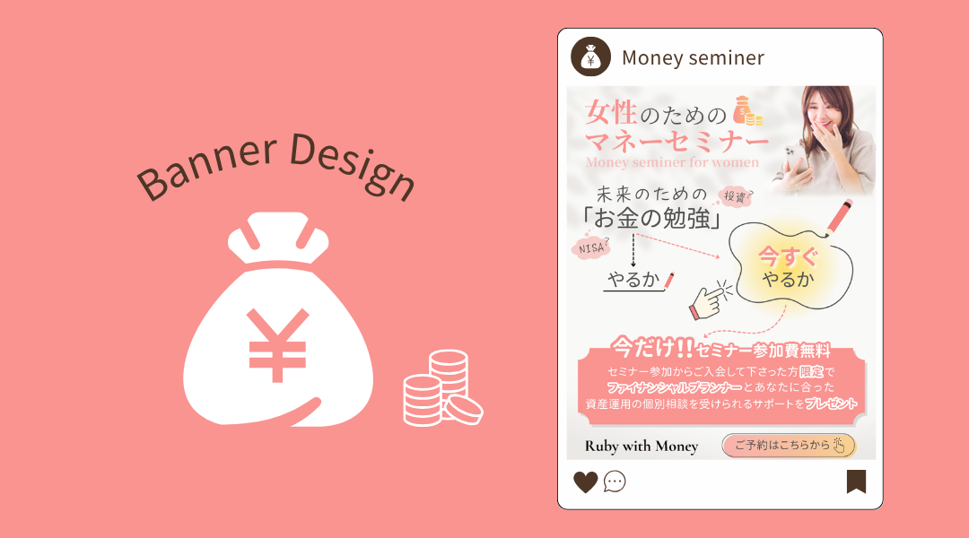 「未来のためのお金の勉強 やるかor今すぐやるか」という選択肢のあるキャッチコピーにして今すぐ始めてもらえるように視線誘導をしました。
