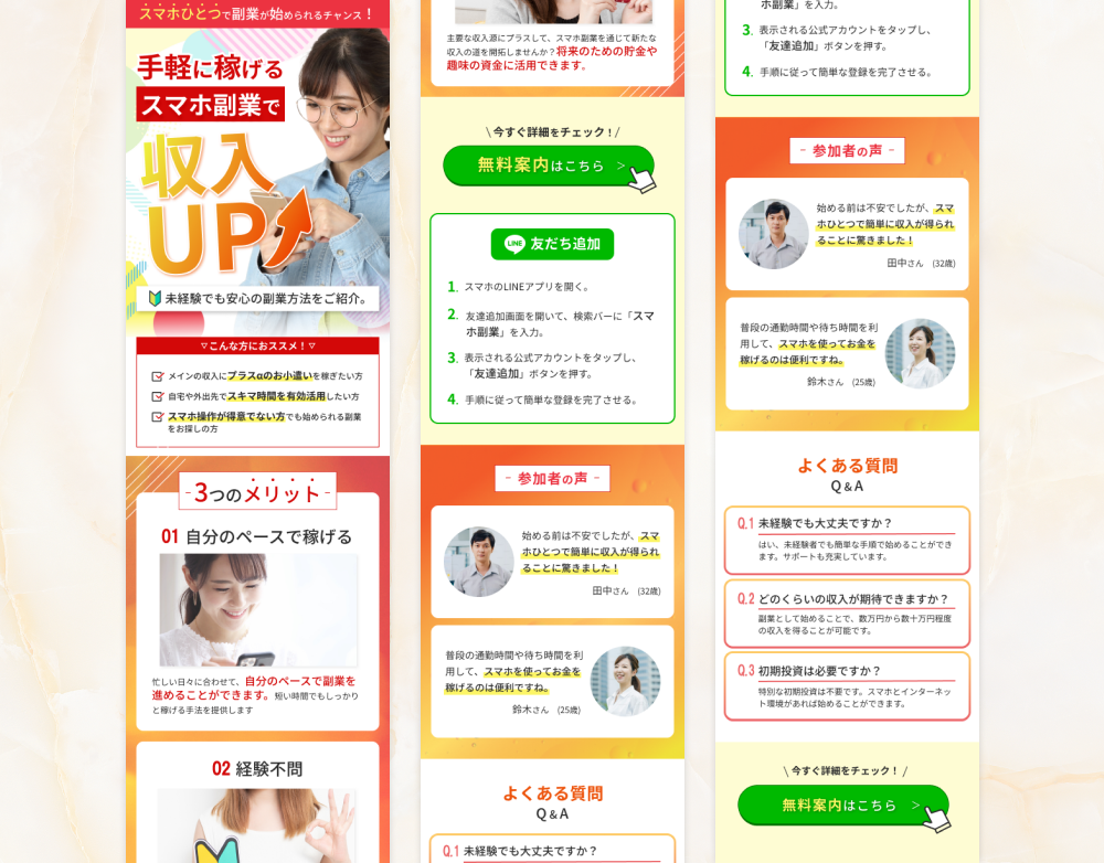 円のあしらいや全体的に角ばった四角は使わず、丸みを出すことでポップさを、FVの 収入UPの文字を傾けることによって目に入りやすく表現しました。