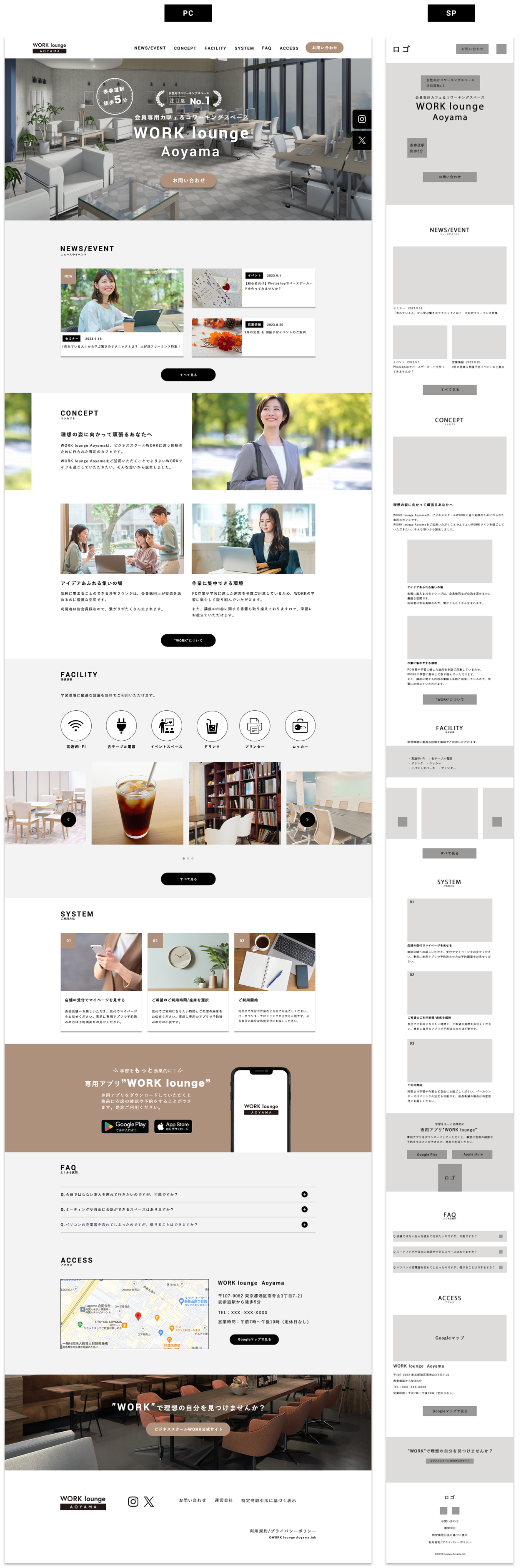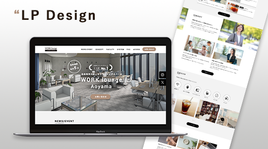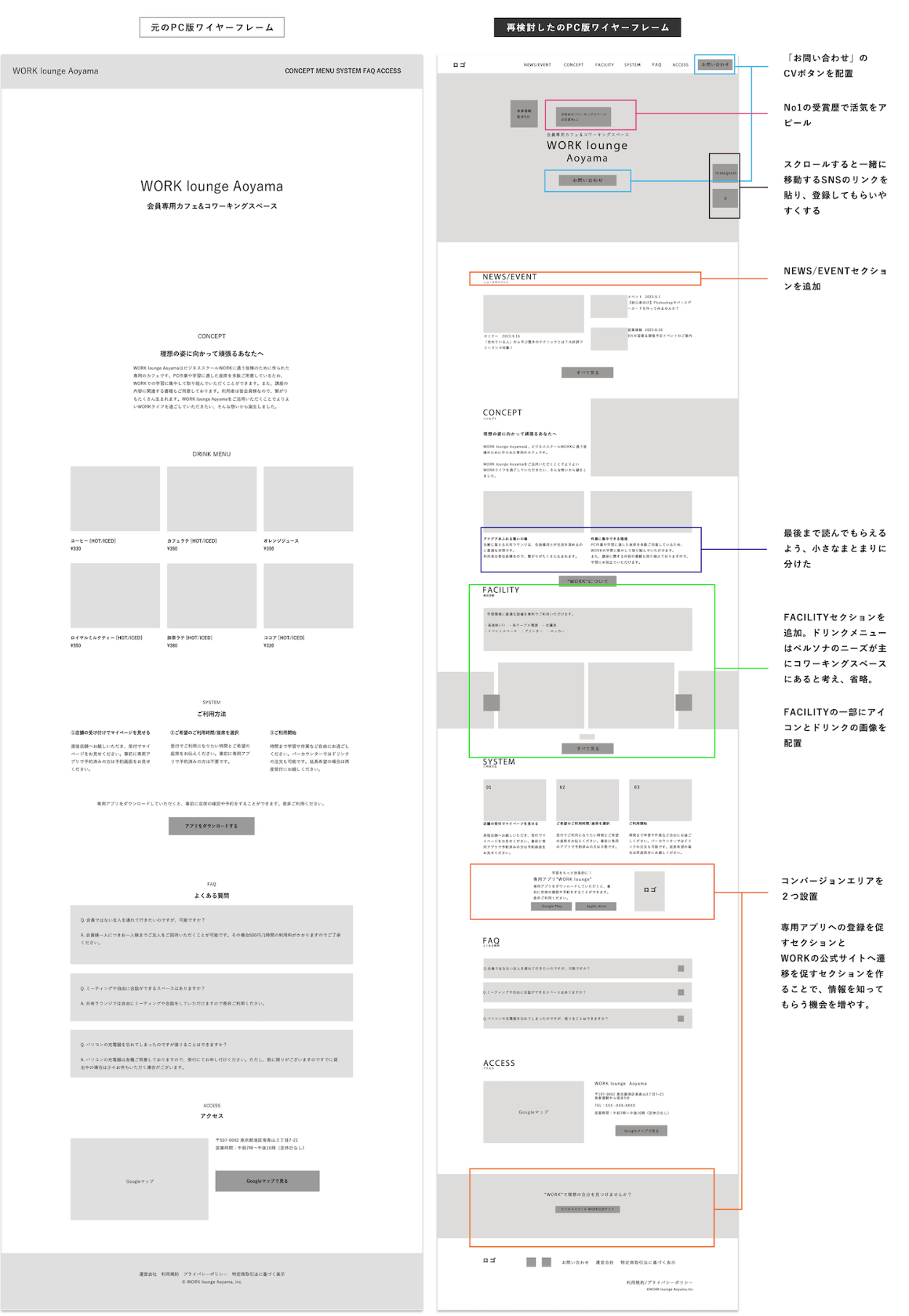 クライアントの目的が「Work lounge Aoyamaについて知ってもらうこと」なので、CVボタン(お問い合わせボタン)をヘッダーとメインビジュアルの中央に配置し、ユーザーに次に取って欲しいアクションを明確にしました。