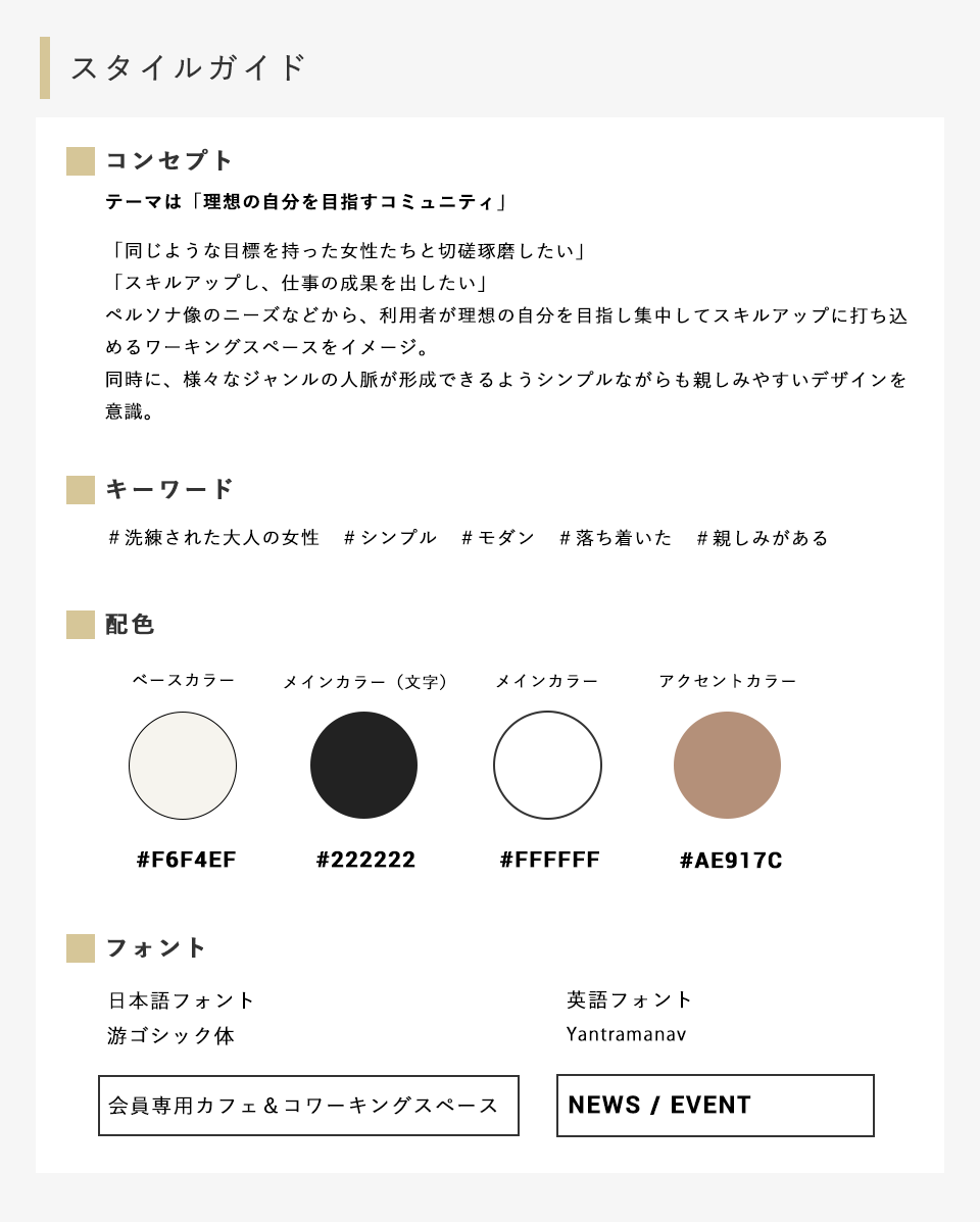 ひた向きに仕事に取り組むペルソナを含め、いろんな価値観を持った女性が集うコミュニティを意識して中性的な色を設定しました。たくさんのアイデアを受け入れて、自分の成長に生かすイメージです。