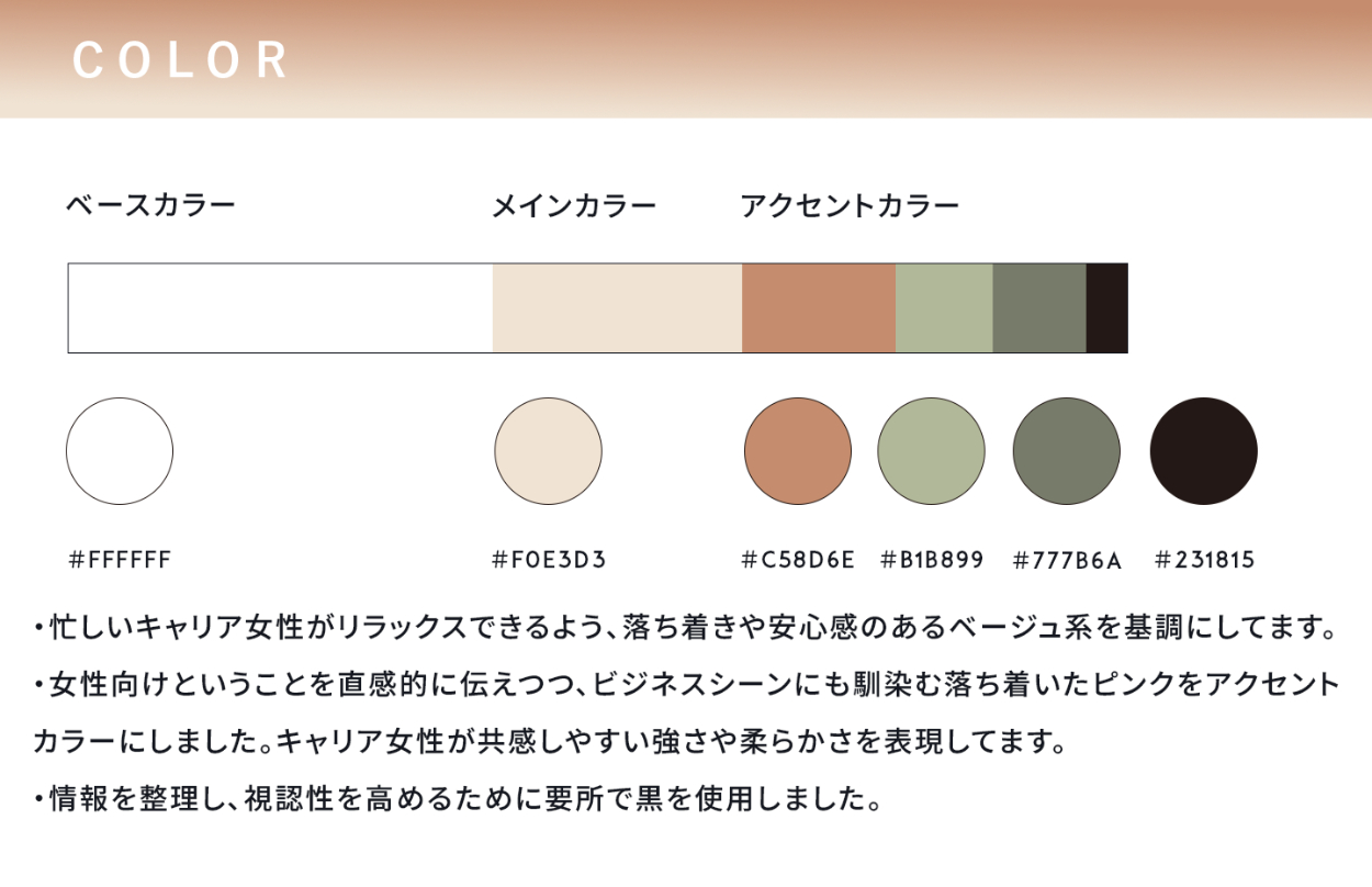 女性が安心して利用できる、洗練された空間を表現した配色にしました
