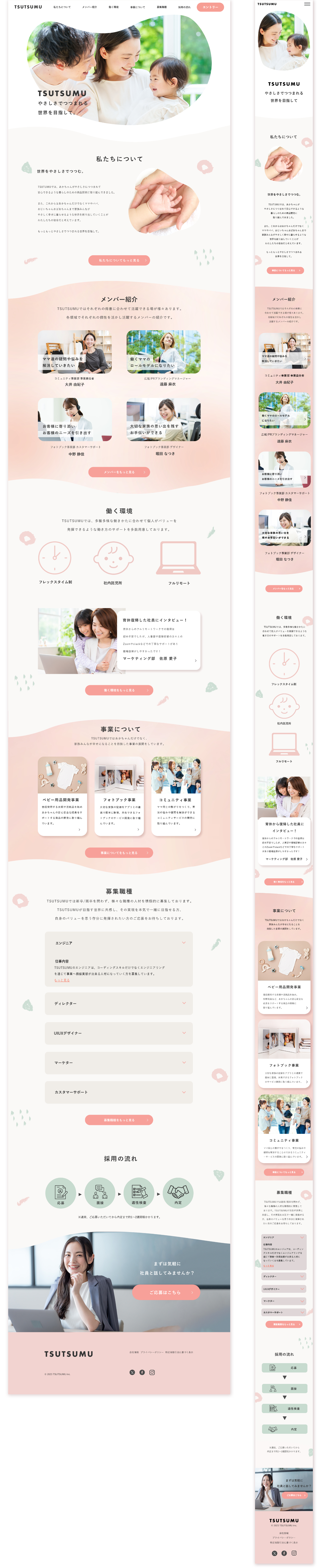 SHElikes MULTI CREATOR PROJECTの課題で、ベビー用品事業等を行う企業の採用サイトの制作に取組みました。クライアントからの要件書を元に、PCとSPのデザインカンプを制作し実装を行いました。SP用のレスポンシブ対応もしています。