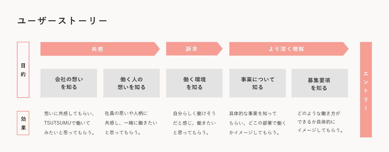 コンセプト・メンバー紹介・働く環境といった " 共感・訴求 " のコンテンツを通してターゲットの「働きたい!」という温度を上げ、事業について・募集要項といった " より深く理解 " するコンテンツに進んでもらい、最終的なゴールであるエントリーをしてもらう流れです。