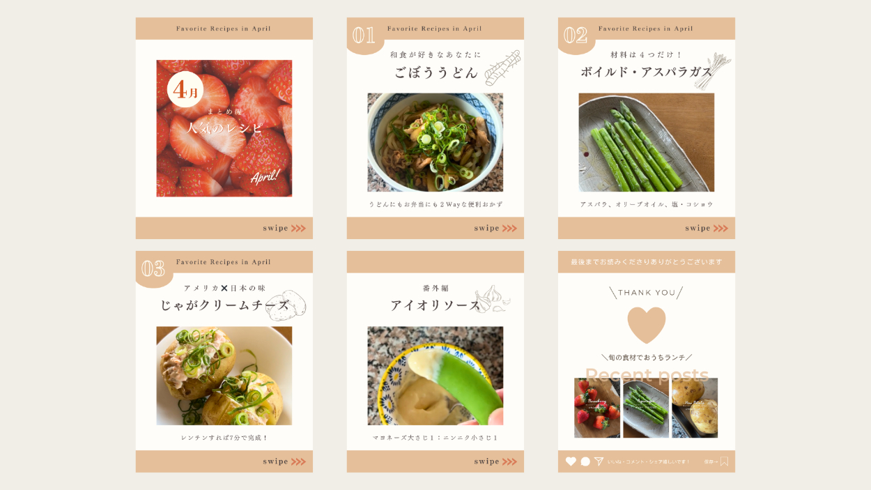 - 短いコピー:各レシピのポイントを1つに絞り、数字を使用して紹介