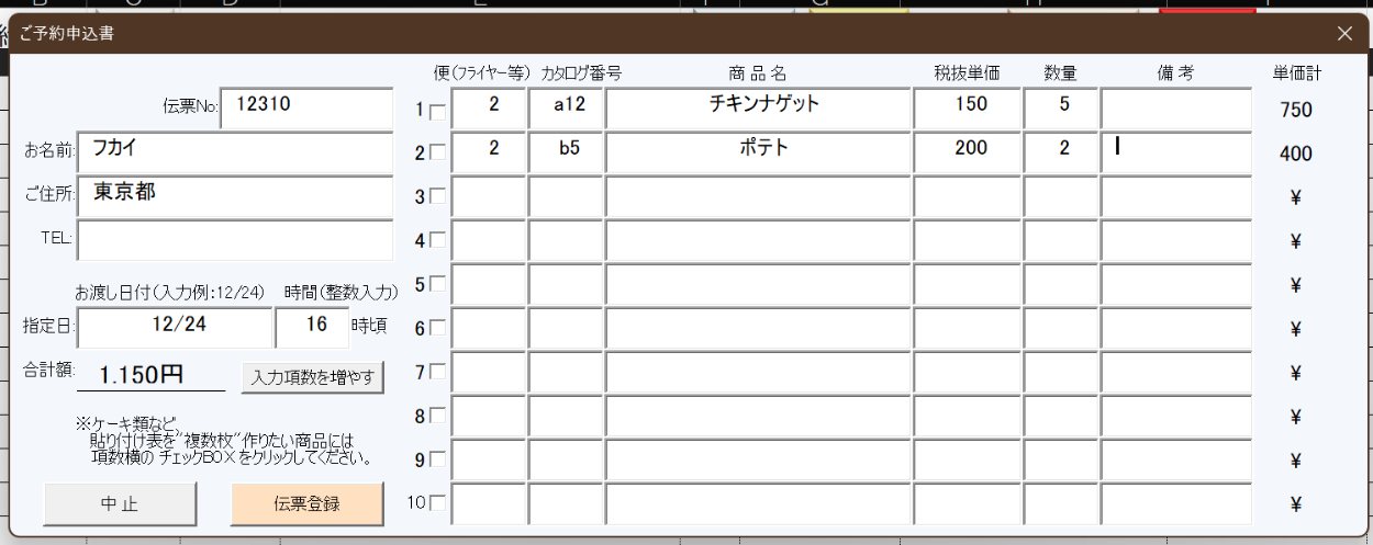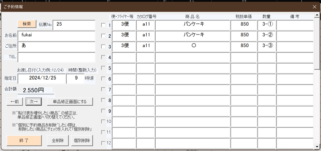 ・入力した予約商品が表示されます。