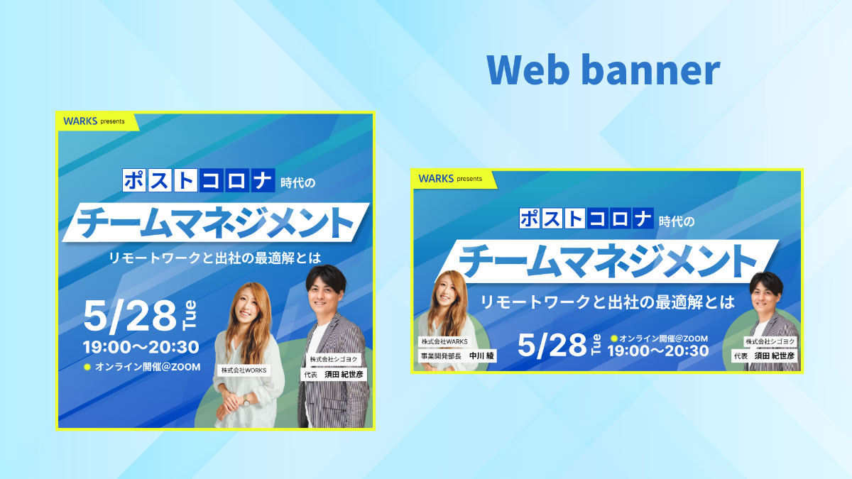 企業に対して新時代のワークスタイルコンサルティングを行う株式会社WARKS(架空企業)が、パートナー企業である株式会社シゴヨク(架空企業)と共同主催するセミナーの告知と集客