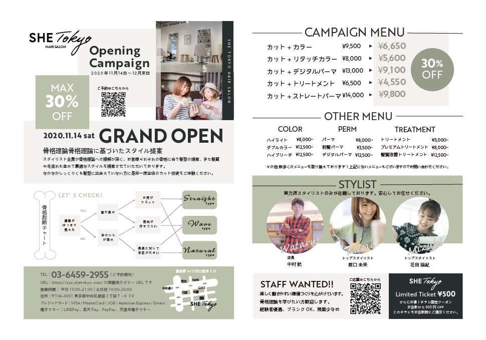 美容室のトンマナと「オープン」「特別価格キャンペーン」「骨格理論」をキーに表現しています。
