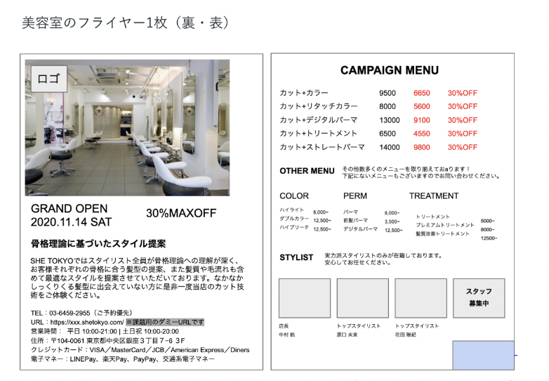 美容室のオープンキャンペーンフライヤー制作に取組みました。クライアントからの要件書を元に制作しました。