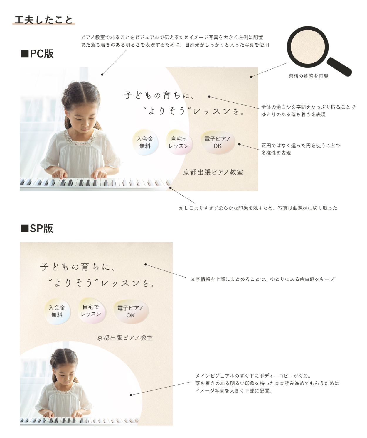 営業の再開に合わせLPの印象をリニューアルし、よりクライアントが目指すターゲットに体験レッスンの予約をしてもらえるようなデザインに改善する。