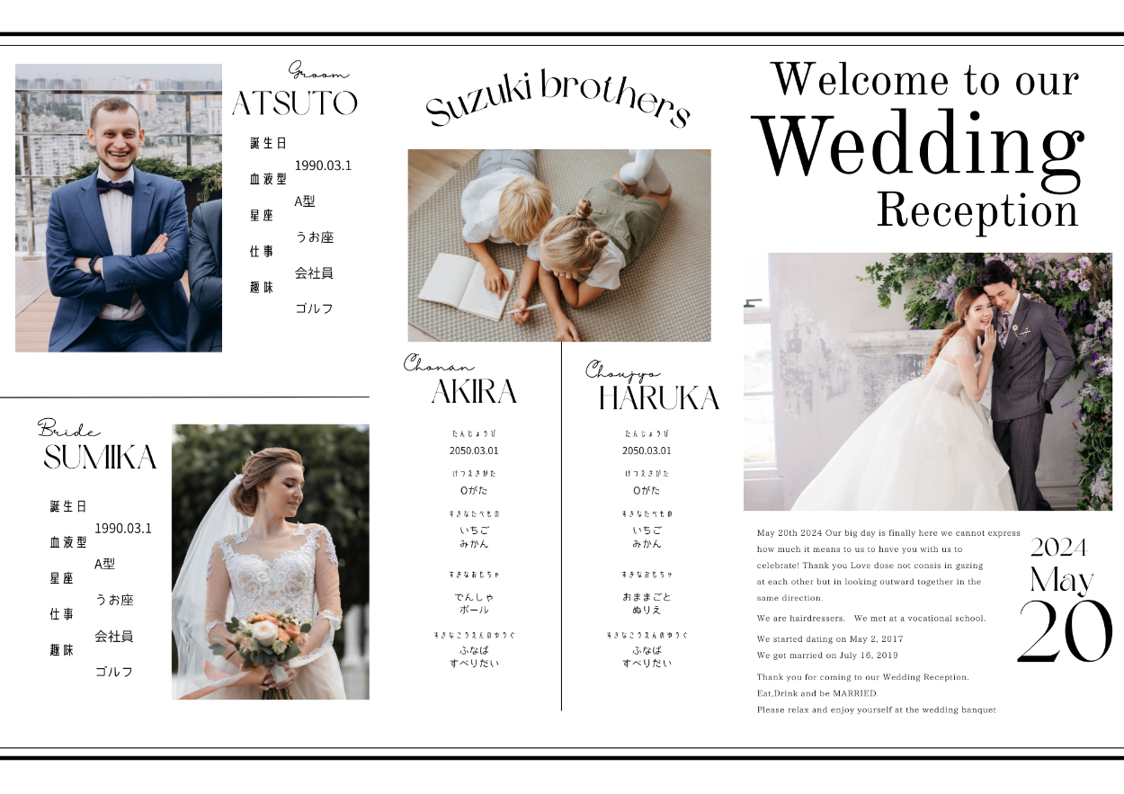 家族婚だったので、新郎新婦、子どものプロフィールを詰め込みました。