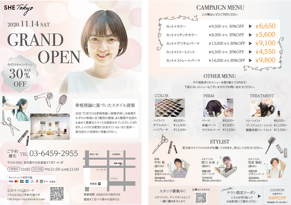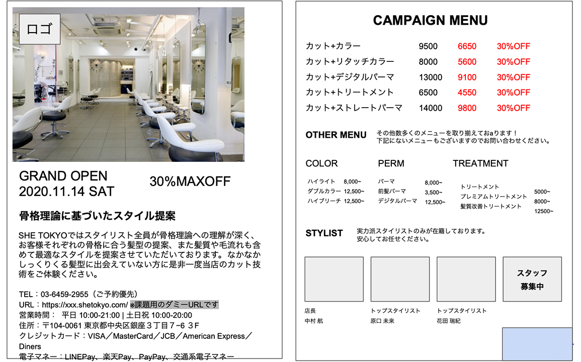 色々なフライヤーを参考にするために探しましたが、新規のお客様がフライヤーを見ただけで行ってみようかなと思わせるために、1枚の紙表裏の狭い空間に入れるべき情報をきちんと入れて、メリハリをつけて目を惹く工夫をつけている参考フライヤーを探し、今回の課題を取り組む上でとても勉強になりました。