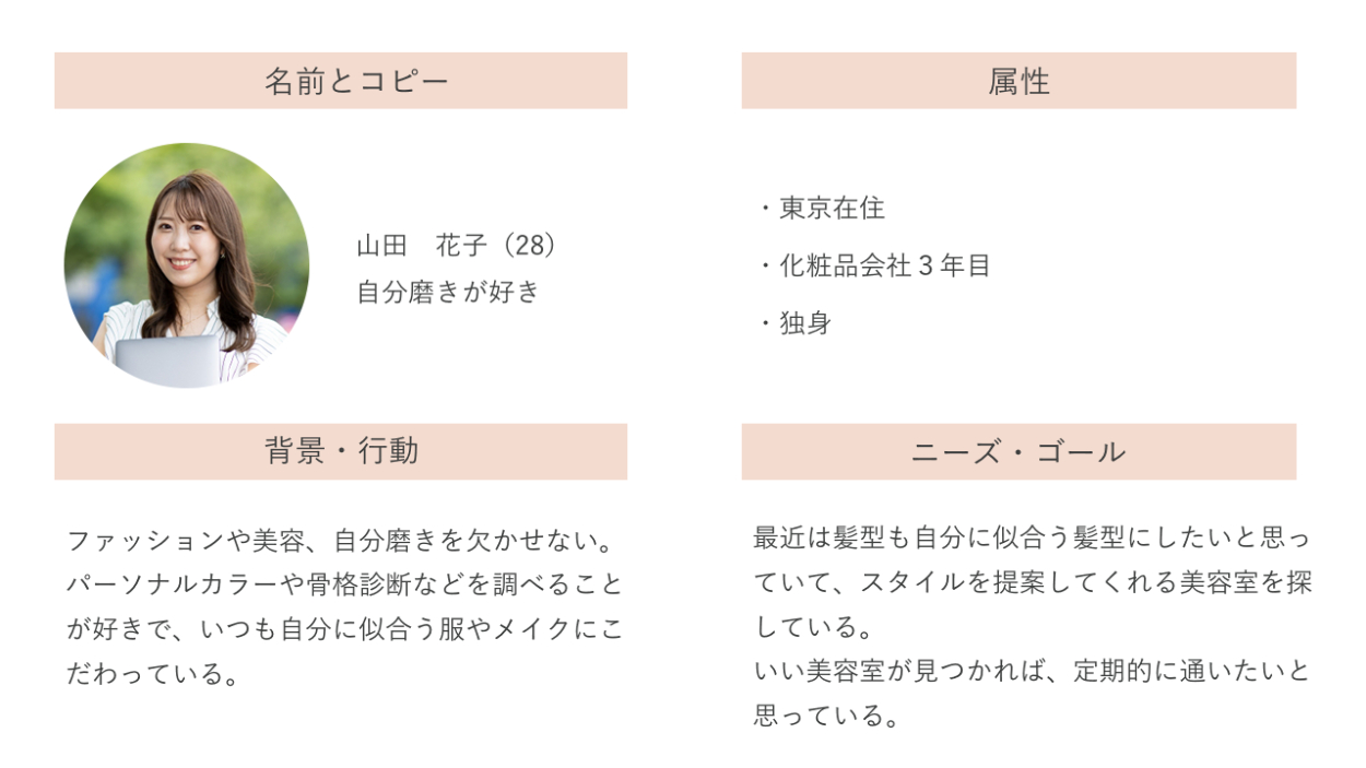作成する際にどんな人が通う美容室かイメージできるように、ペルソナを設定しました。独身で自分に使える資金が多く、また最近流行りの自分の骨格やパーソナルカラーを診断していて、自分磨きを欠かさない。そんなワードを出すことで、デザインのイメージがつきやすくなりました。