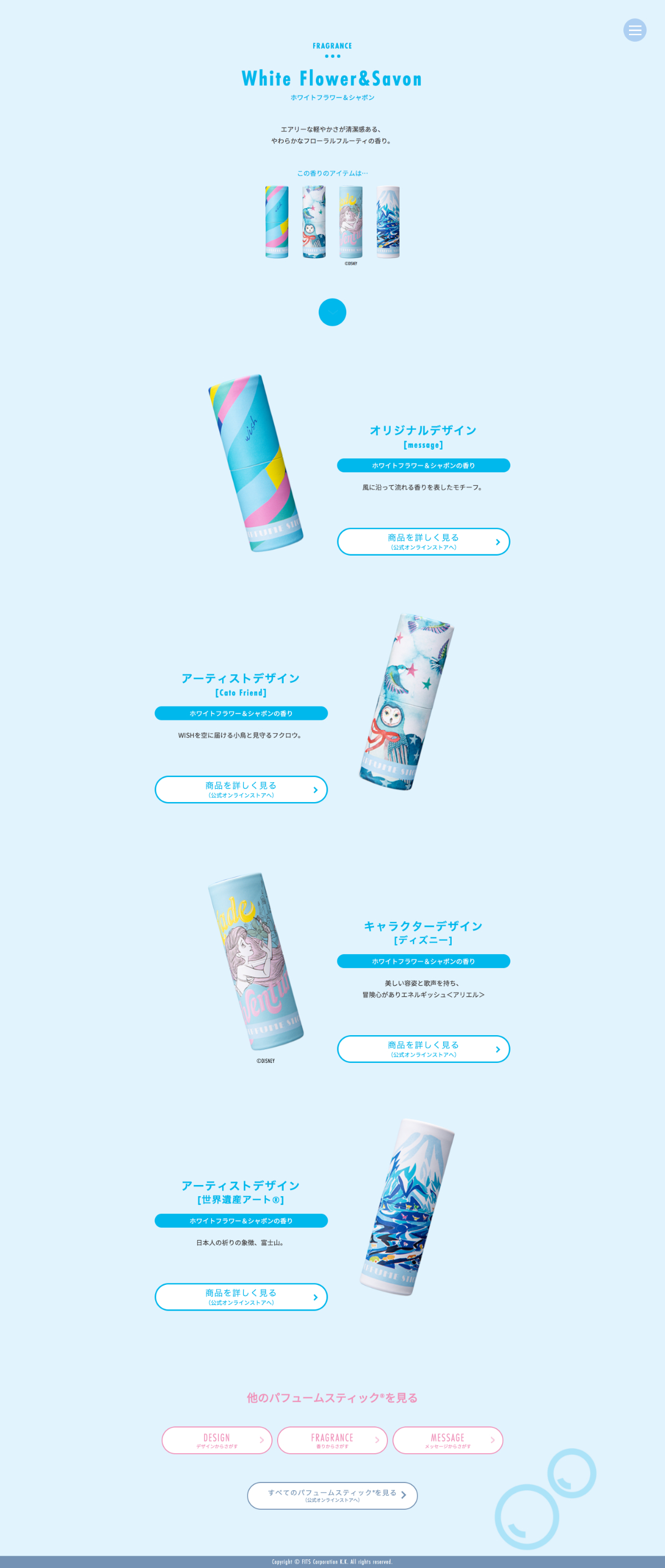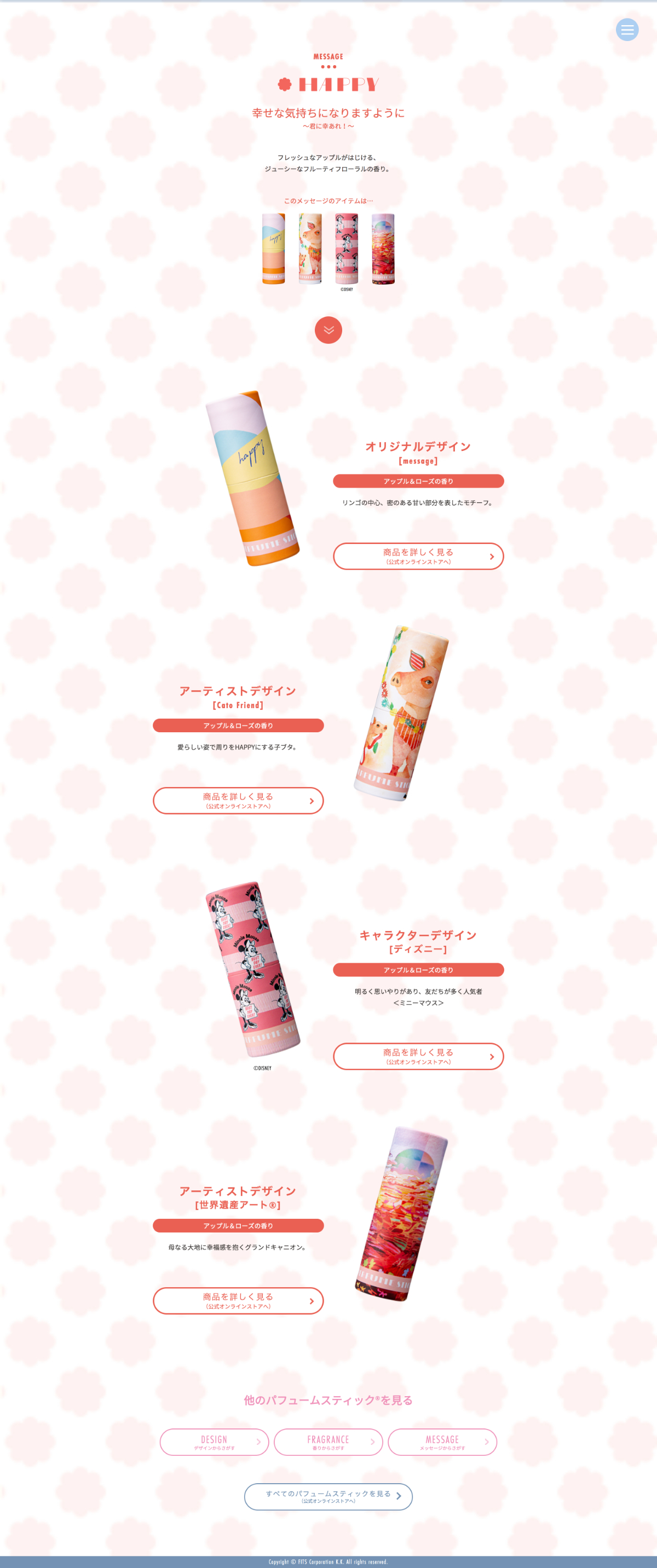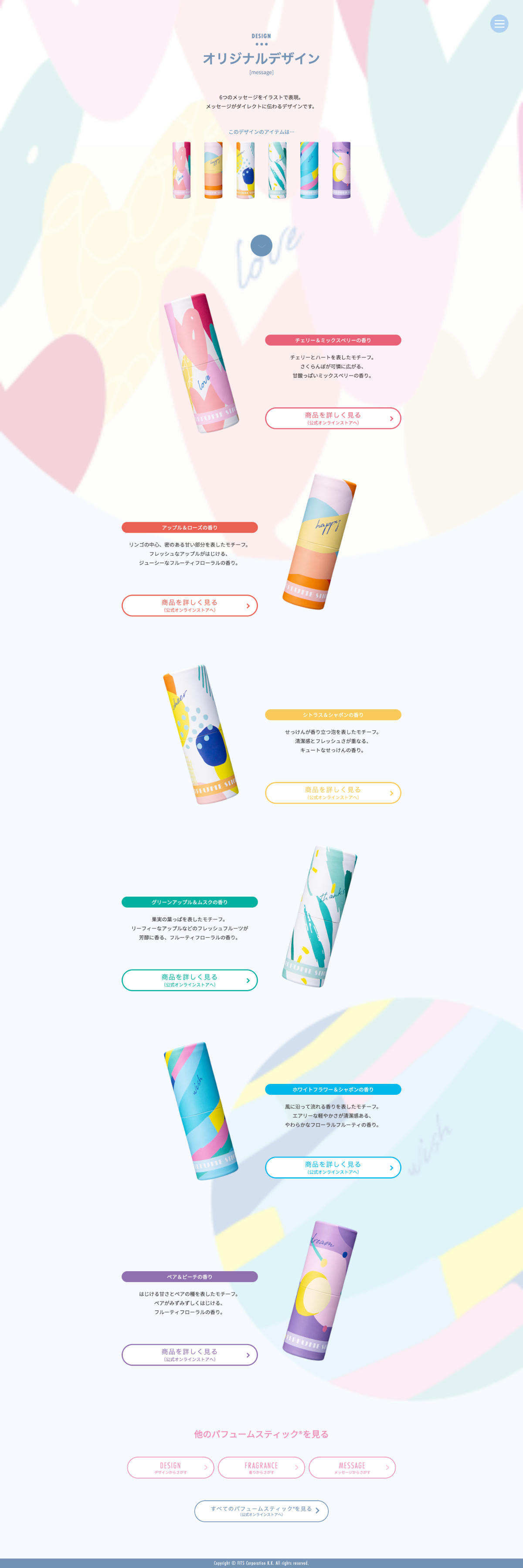 6種の香りと24種のパッケージデザインを基に「選ぶ楽しみ」が感じられるコンテンツを設計。商品紹介ページでは、デザイン毎にバックグラウンドを切り替えることでバリエーションの豊富さや、パッケージの可愛らしさを表現いたしました。