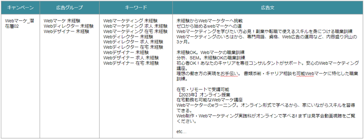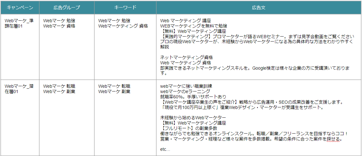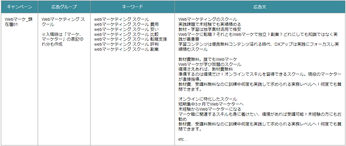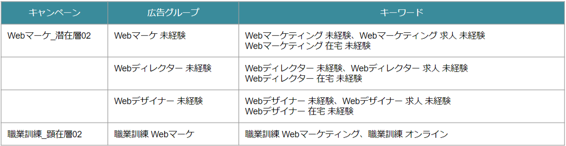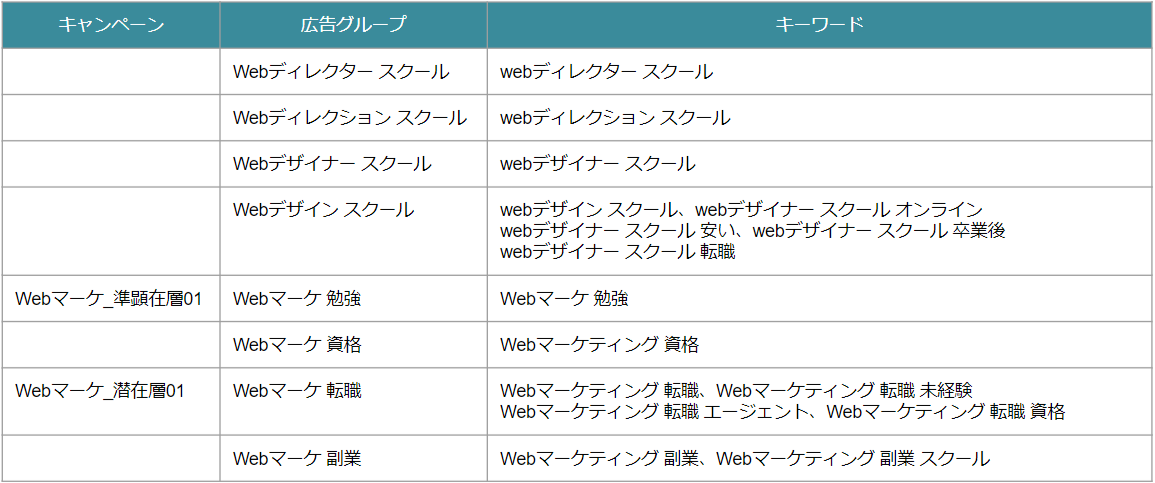 各層ごとにキャンペーンを切り分けてキーワード設定をしていきます。サジェストについては、ラッコキーワードなどのツールを使い検索し、ロングテールキーワードで検索した広告文を自社仕様に書き換えて設定しました。