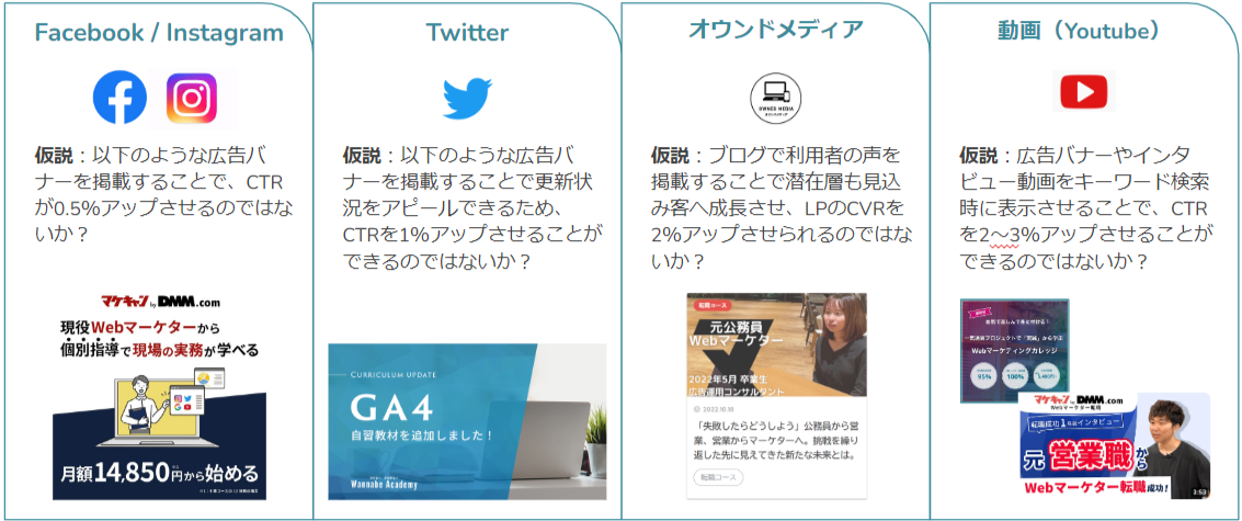 SNS広告のCTRは、2021年度版の調査でフィードが平均0.5%~1.5%程度、動画フィードでも3%弱となっておりましたので、大体の目安として設定しております。昨今、動画メディアでの広告は、ターゲット層の目に止まりやすいコンテンツですので、卒業生の声や見学会の様子、講師陣の紹介、受講風景などが分かるような動画フィードがあると、CTRアップやCVアップに効果がありそうと考えました。
