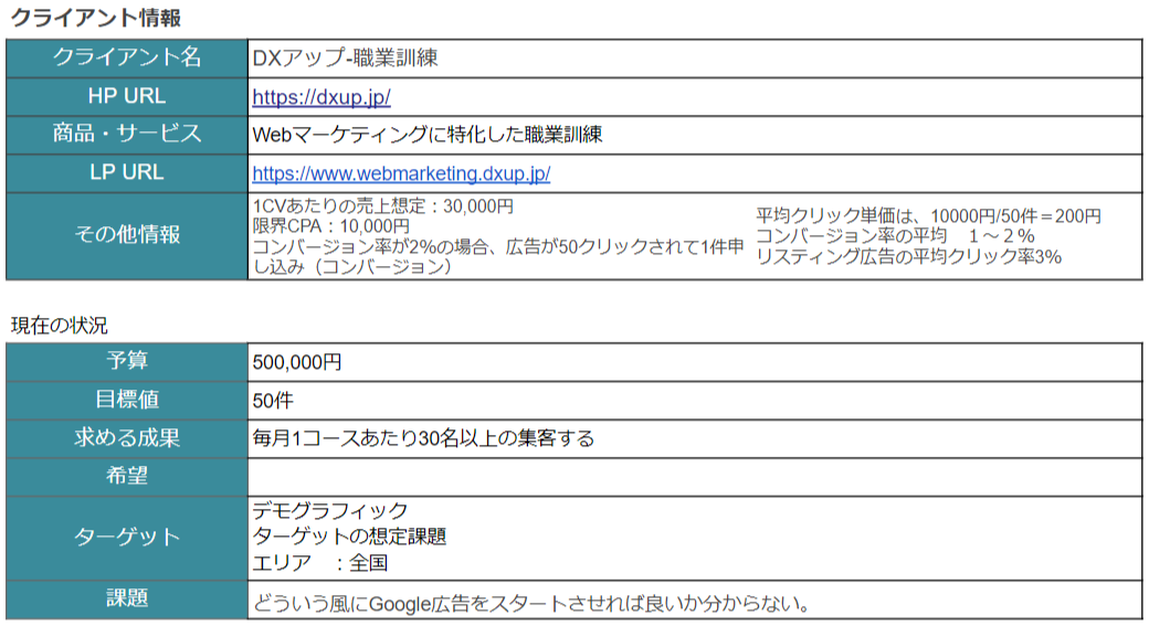 クライアント情報のその他情報は、お客様のWeb担当が想定している予算感です。限界CPAが1万円の為、目標値は50件で設定しております。Webマーケティングに特化した施策ですが、Webデザイン・Web制作の養成コースもあり、求める成果として1コース30名以上目標とすれば目標値に到達できるという仮説で設定しました。