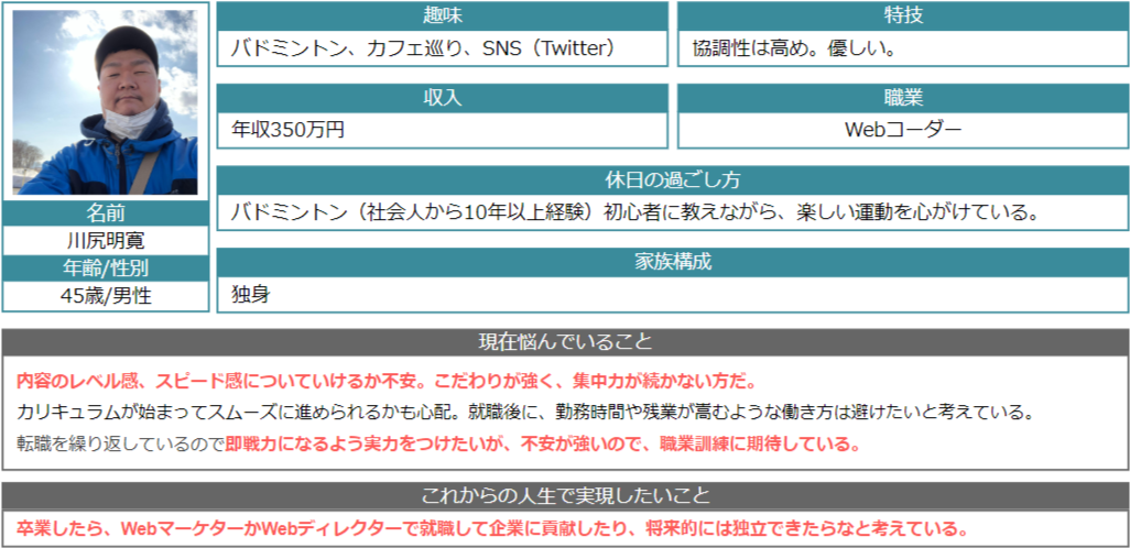 ペルソナ(次項目参照)が前職Webコーダーであることから、ターゲット層は同業者となり、うち正社員勤務を希望している層として算出しております。但し、148万人には、その他の専門・技術職も含まれる為、概算として設定しております。