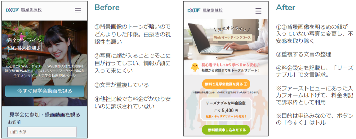 LP遷移された際に極力離脱を防ぐために、ユーザーをペルソナなのように経験したこともあるがイマイチ自信がない受講生向けの内容もファーストビュー内に掲載することで、ユーザーに選択肢を与えてることで離脱を防げると考えました。また、競合比較してしまったユーザーに対して費用面で訴求できるよう敢えて表示し、初心者向けの見学会動画の誘導ボタンには「無料で」の文字を追加することで安心感を与えるように演出しています。