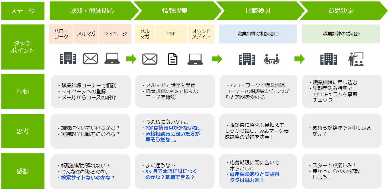 ペルソナ設定を元に、カスタマージャーニーを作成します。従来の行動パターンは、タッチポイントが少なく、比較検討のフェーズにいたるまでに情報が十分に収集できていない状態になります。その為、検討段階に入っても競合のコンテンツの魅力に惹かれ離脱につながる可能性がある為、比較検討前の段階でのタッチポイントを増やす必要があると考えました。