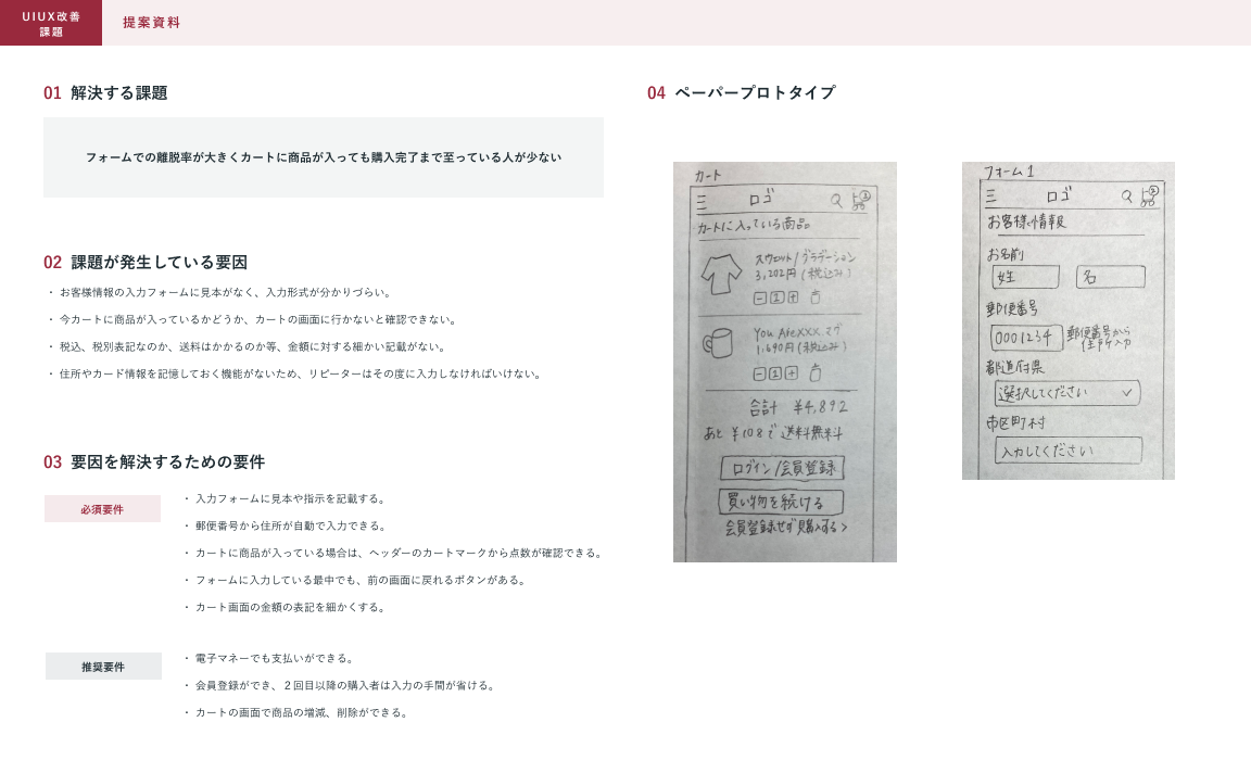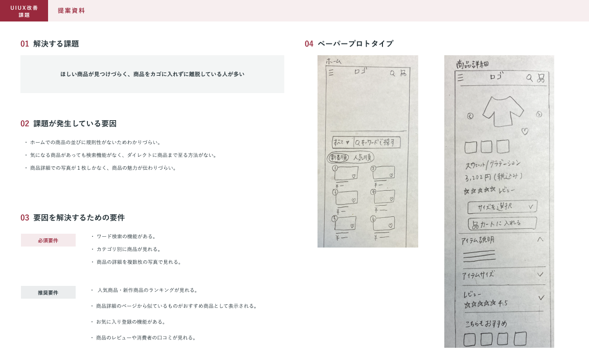 要因や要件、提案を言語化することが難しかったです。また、必須要件と推奨要件の分別にも迷ってしまいました。今回の課題を通して、ユーザー目線に立ってサイトの使いやすさを観察する視点を少し持てたように感じるので、今後も日常的にECサイトを使用するときは観察していきたいと思いました。