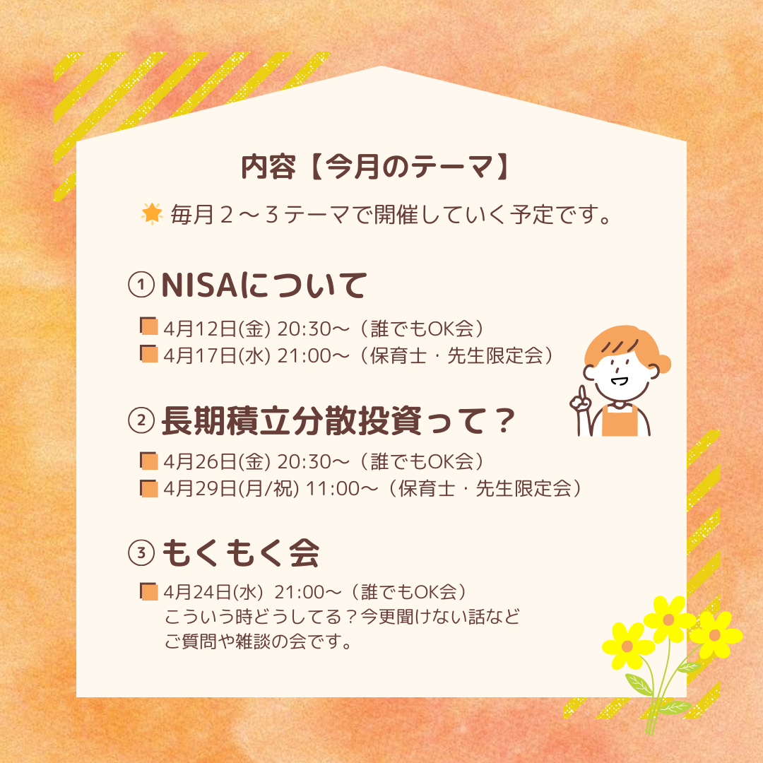 FPの知識とコーチング技術を掛け合わせて、保育士さんや先生がハッピーになることを通じて、その先の子どもたちもハッピーになってほしいという願いから「ハピハピ」というコミュニティ名にされたそうです。