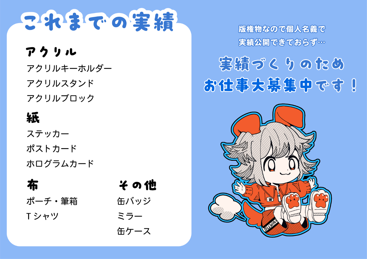 「イラスト制作」「デザイン制作」「入稿データ制作」グッズデザインの主要ステップを全てお引き受けします ・1枚のイラストでいろんなグッズを作れる ・イラストとデザイン一括で作成するため進行がスムーズ ・既存イラストにデザインを加えるだけのオーダーも大歓迎です