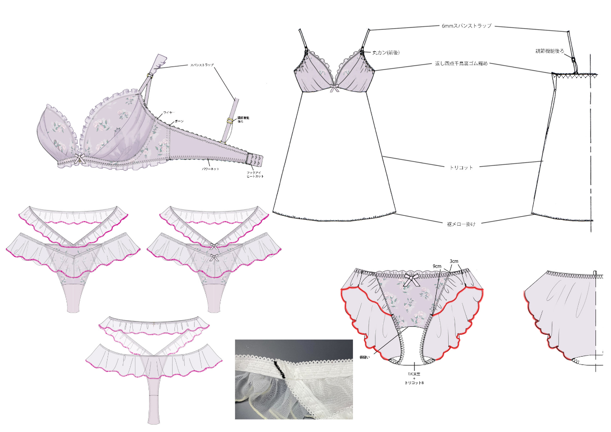 またPhotoshopで絵型に落とし込み、配色やリボンやレースの組み合わせ、テキスタイルの見え方をシミュレーションしました。