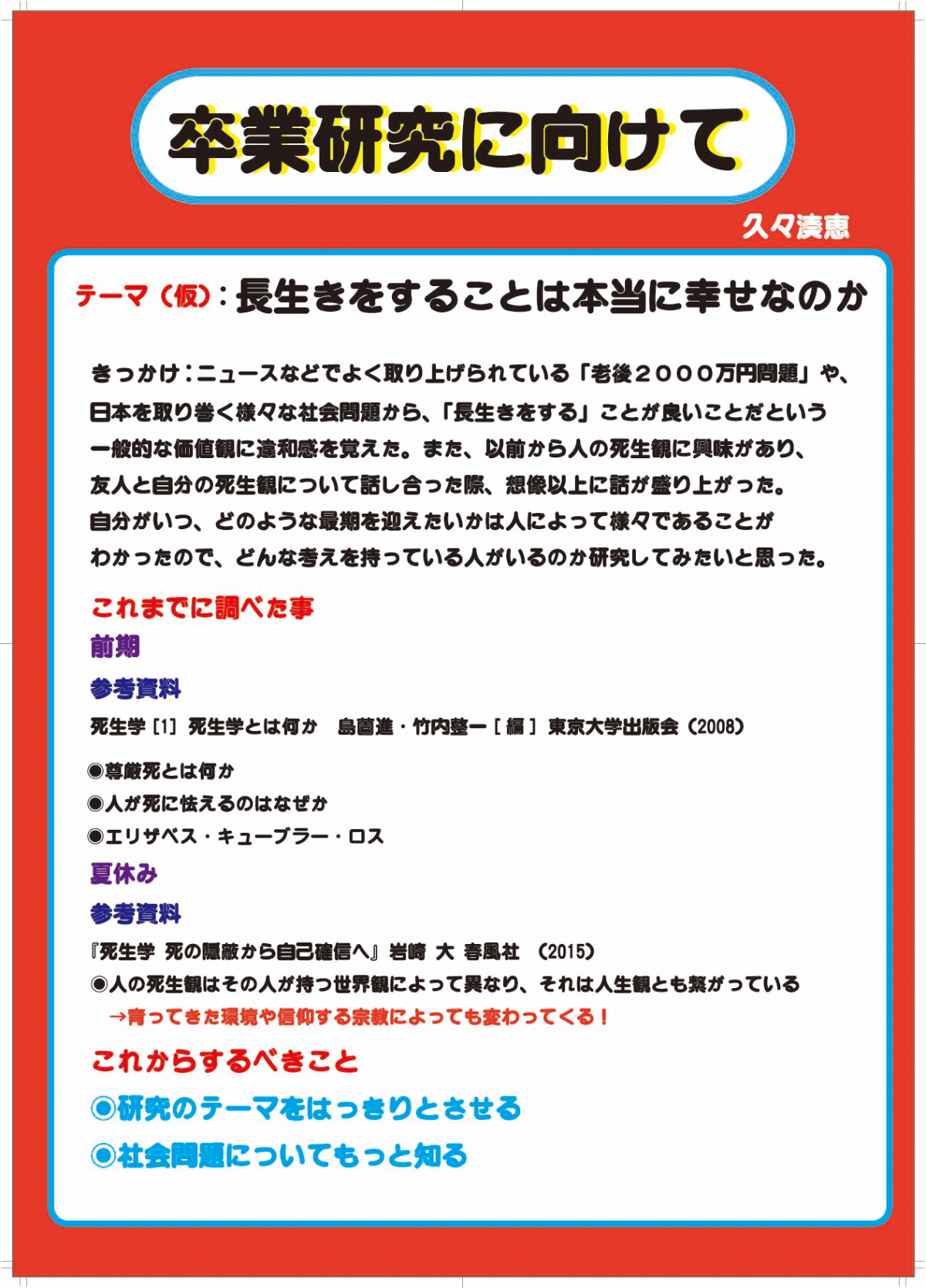 卒業研究に向けて 久々湊 恵 OVERVIEW 内容:ポスター(A2サイズ) 制作期間:2週間 使用ツール:Illustrator YEAR 2023 3年次の成果展に出展するために制作しました。卒業研究に向けて現時点でどのようなことを行ってきたかを、見やすく、伝わりやすい構成になるように意識しました。