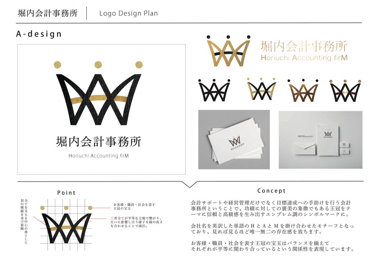 会社名(英訳)の頭文字をとった「H」と「A」と「M」を掛け合わせ、功績に対しての褒美の象徴でもある『王冠』をテーマに、ロゴ作成を行い、「お客様」「職員」「社会」が支え合うというバランスを王冠の宝玉にて表現致しました。