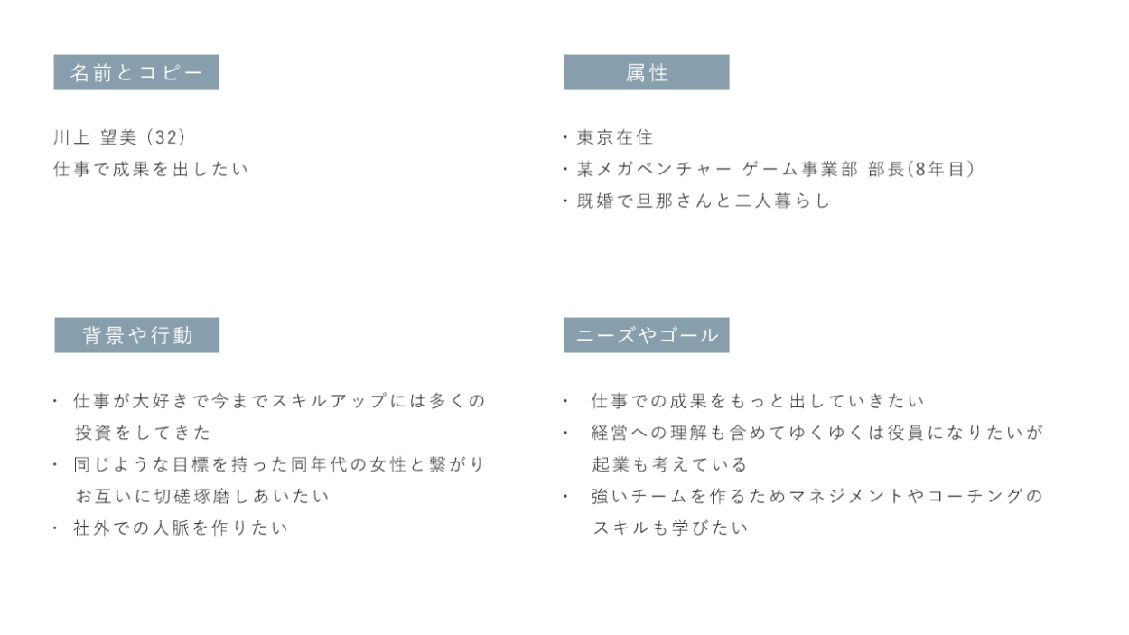 ペルソナはキャリアを向上させる繋がりを求めているので、交流会やビジネスコンテストを通して、ビジネスコンテストや交流会を実施していることを特徴のひとつとして追加しました。