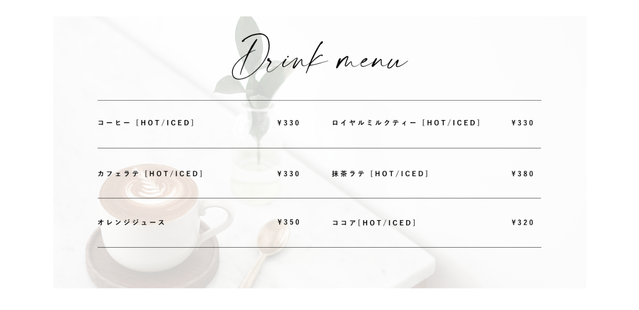 最重要項目ではないため、カフェラテの画像の上にメニュー表のような形で配列し、コンパクトにまとめました。