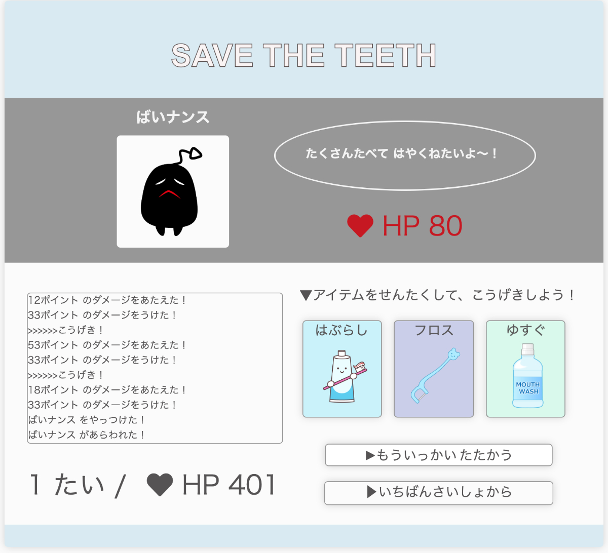 「はみがき」「フロス」は敵への攻撃、「ゆすぐ」は敵からの逃走が可能です。