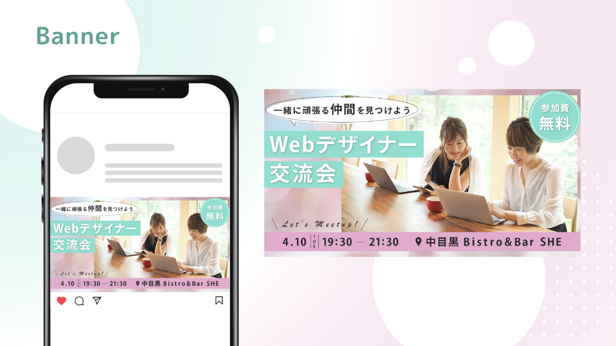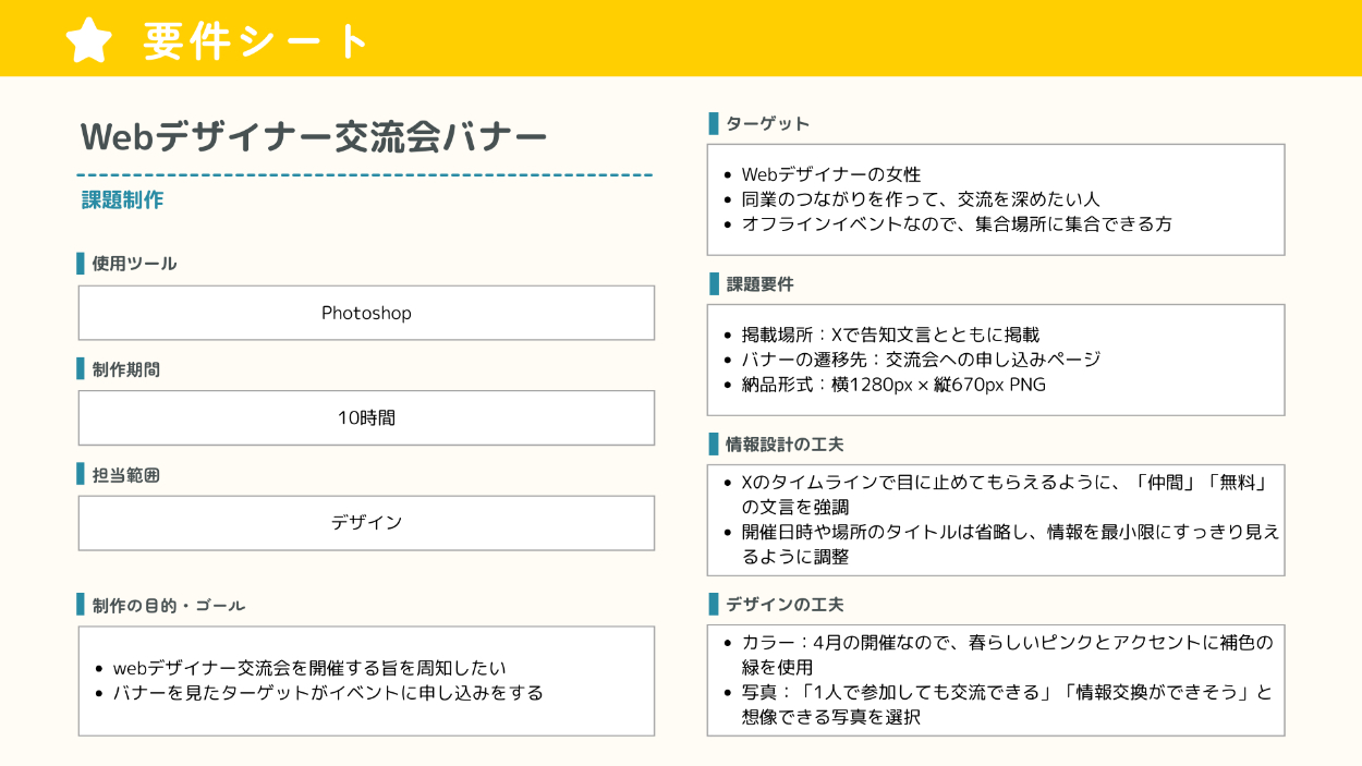 課題制作|Webデザイナー交流会バナー なこ Webデザイナー OVERVIEW 架空のWebデザイナー交流会告知バナー(X用)を作成しました。2025.4 YEAR 2025 制作物制作の振り返りXのタイムラインで流れることを想定して、一目で何を伝えたいかを意識して作成することを学びました。