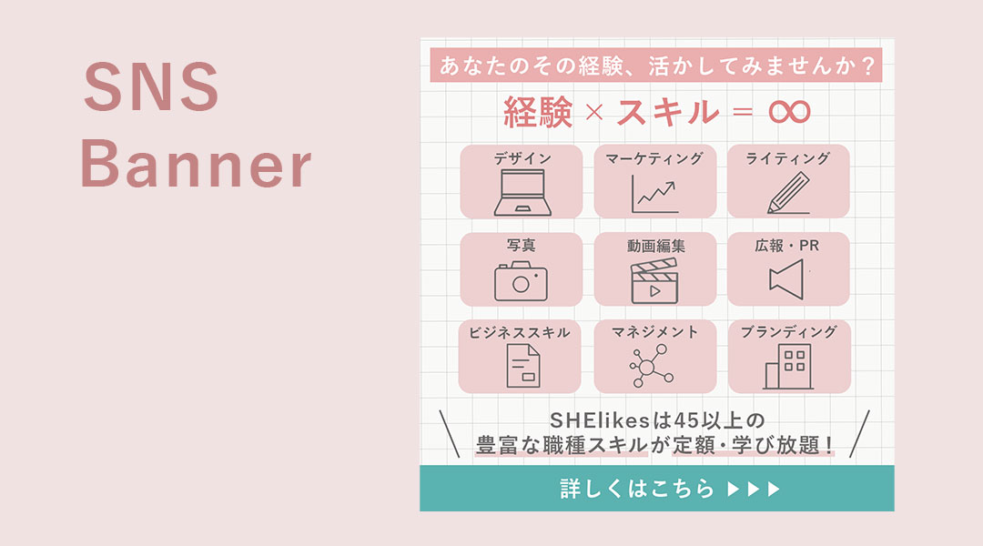 SHE株式会社様の運営するキャリアスクール「SHElikes」のLINE配信用バナーを制作し、コンペ形式で採用していただきました。