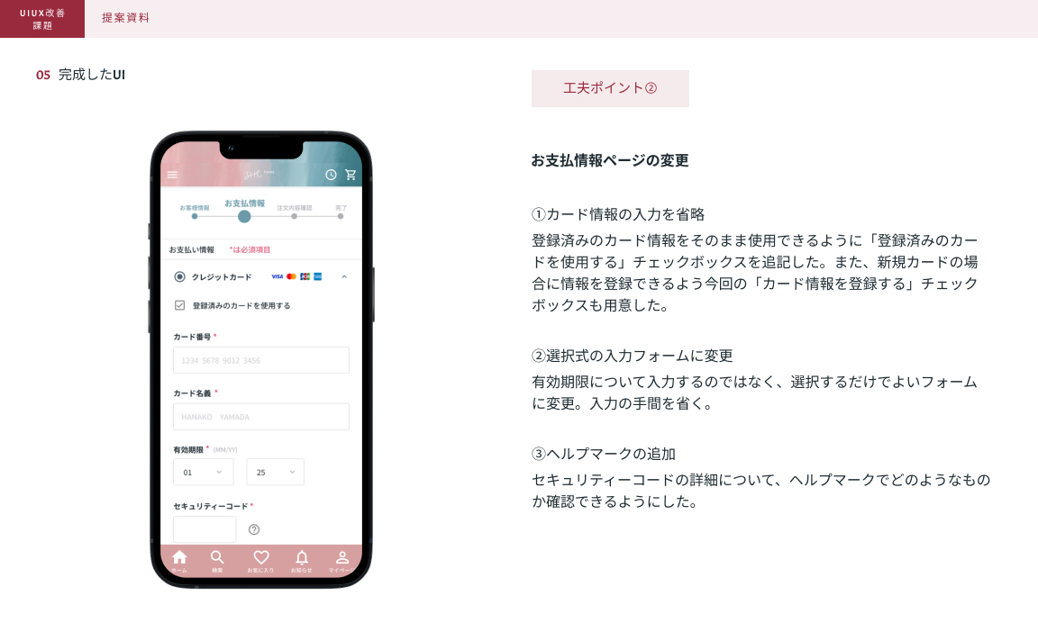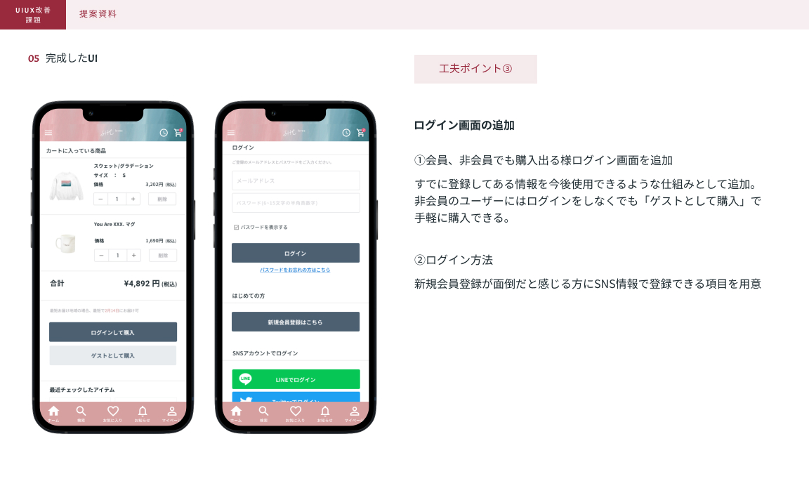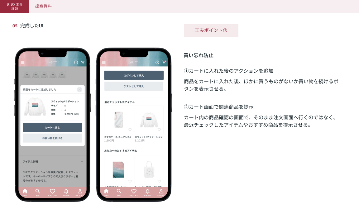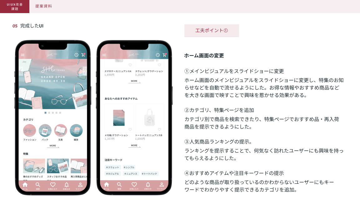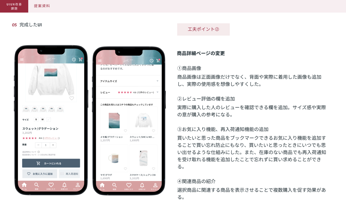 SHElikes MULTI CREATOR PROJECTにて、UI/UX改善提案課題に取り組みました。ペーパープロトタイプ、Figmaを使用したデザインカンプ、改善提案資料を作成しました。