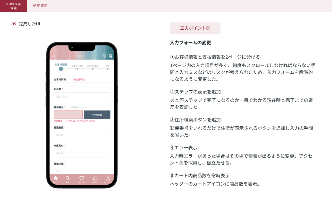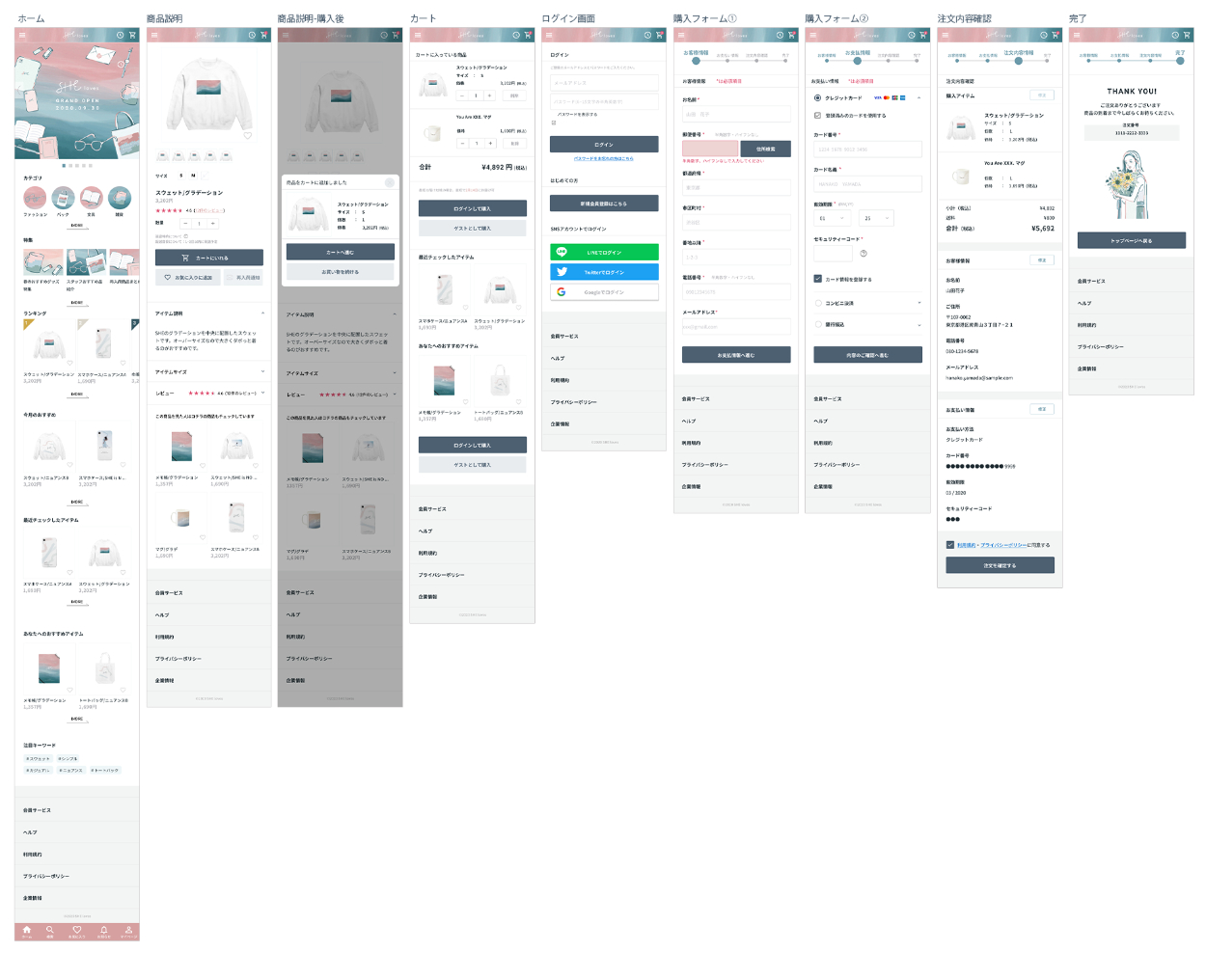 課題に取り組むにあたってUIUXの基礎を学ぶことができました。いかにユーザーに悩ませないか、迷わせないかということが大事であり、配色や余白のとり方などによって影響することを感じました。普段、ECサイトを使用する身としては何気なく使っているものでも細かい工夫があるのだと思いました。