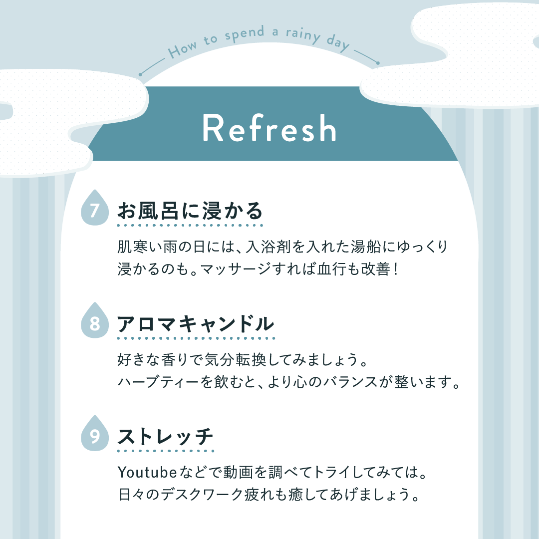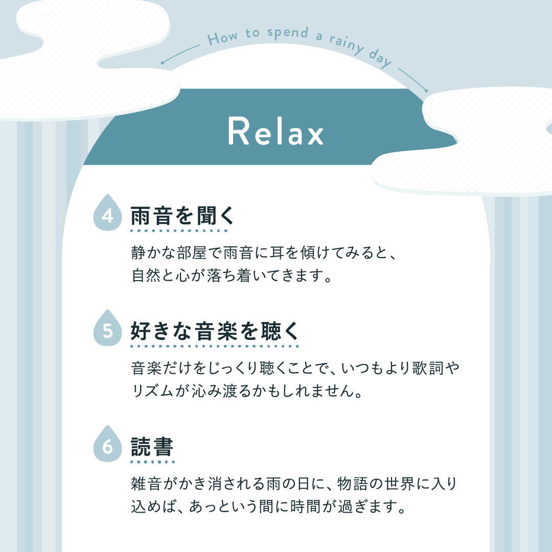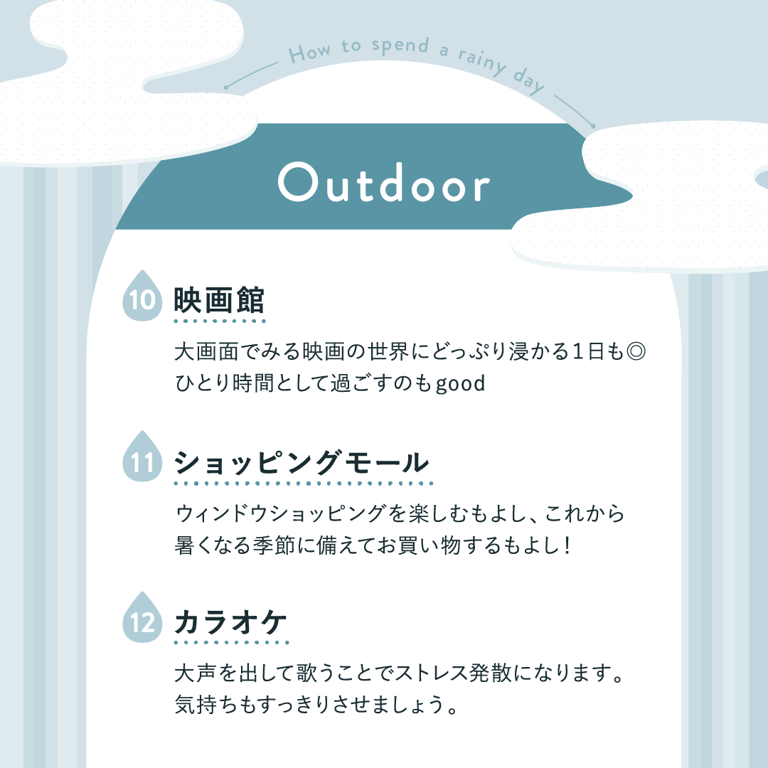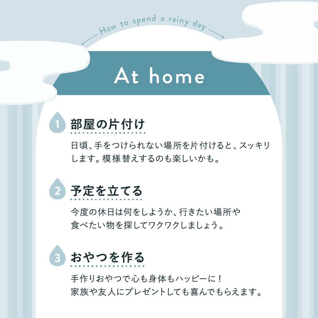 ・テーマに沿って、雲と雨を連想させるようなあしらいをデザインしました。ページごとに雲の位置をずらすことで、動きをプラスしました。