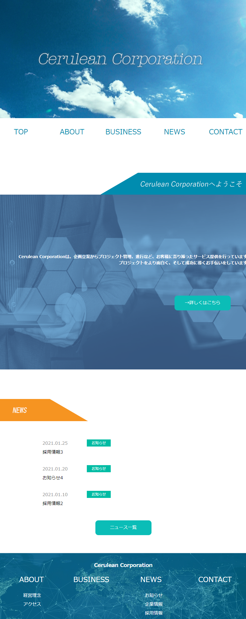 Cerulean Corporation mori anri Webデザイン、コーディング OVERVIEW 架空のSES系企業のコーポレートサイトをWordpressにて作成。 YEAR 2020 Wordpressにてオリジナルテーマを制作し、架空のIT系企業のコーポレートサイトを作成。ターゲットは顧客、及び求職者を想定し、全体的に青系の色で信頼感のある配色を心掛けました。